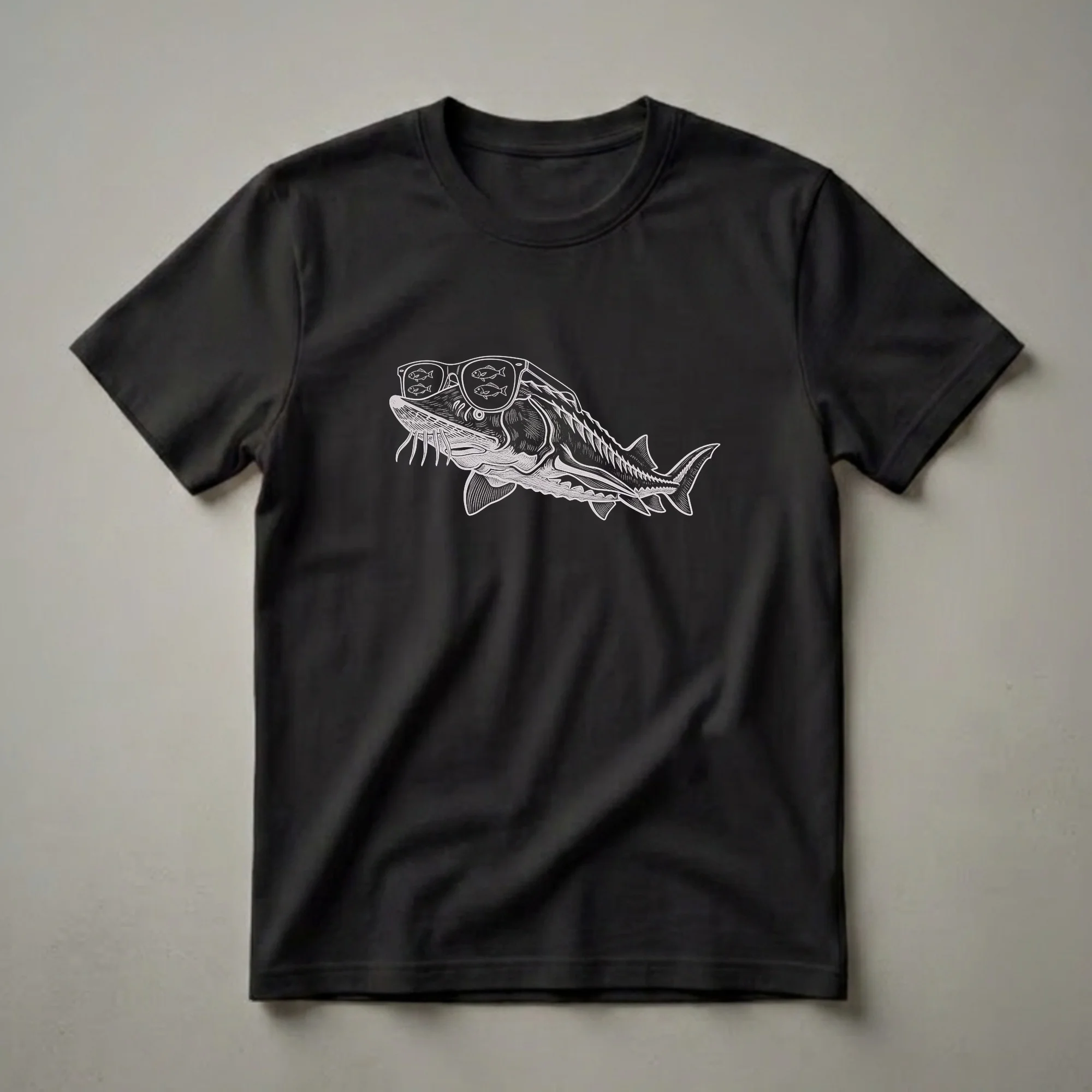 Sturgeon enthusiasts will appreciate this striking graphic tee featuring a detailed vintage drawing of a sturgeon sporting cool sunglasses. The artwork showcases the ancient fish with its distinctive bony plates and barbels, rendered in a classic white line art style against a solid black background. Within the lenses of the sunglasses, smaller fish are depicted, adding a whimsical touch to the marine theme. Sturgeon are among the oldest fish families, with some species dating back to the Jurassic period, making this shirt a wearable piece of natural history. This t-shirt works well for anglers, marine biologists, or anyone who admires these magnificent creatures. It makes a thoughtful gift for the fisherman in your life who enjoys unique and artistic apparel. Wear this eye-catching shirt to your next fishing trip or casual outing to spark conversations about marine life and vintage art. These ancient fish inhabit freshwater and coastal waters across the Northern Hemisphere.
