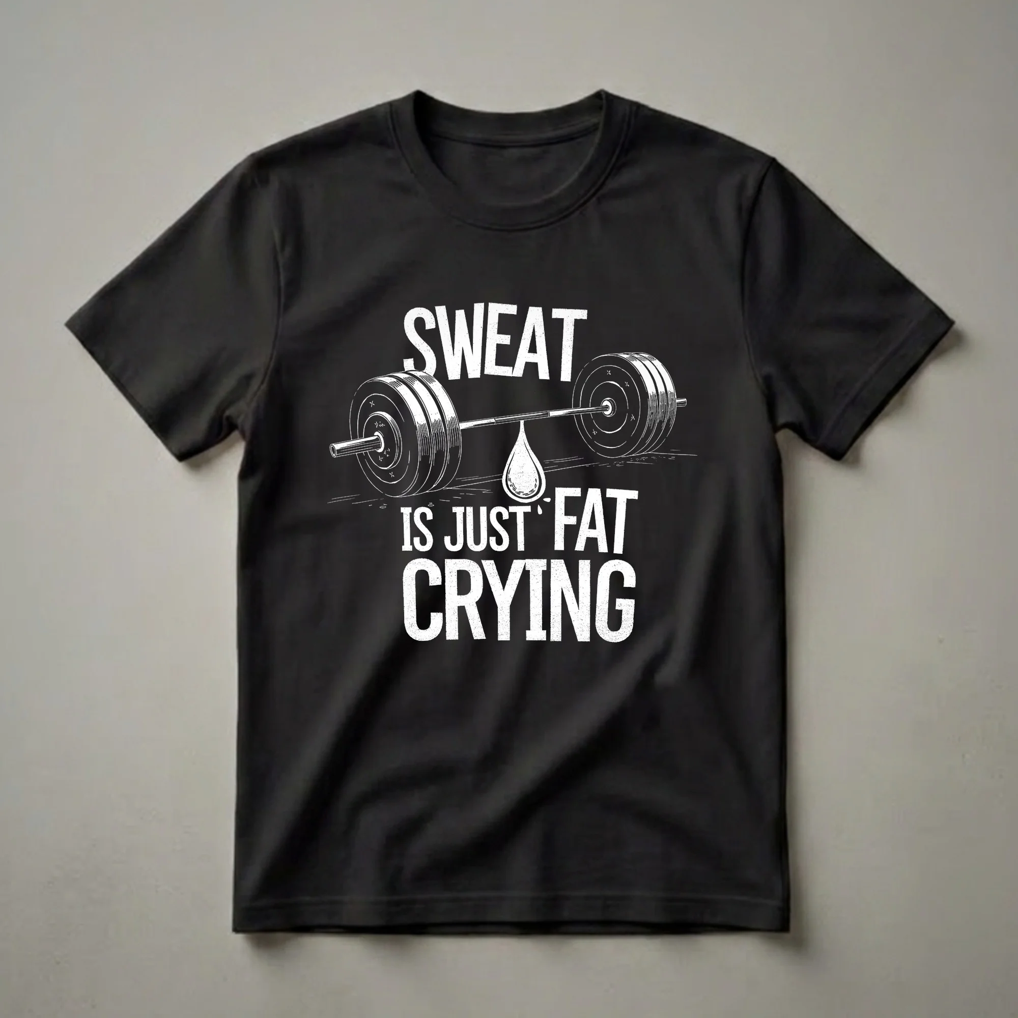 Gym enthusiasts and weightlifters who push their limits will appreciate this bold graphic tee. The design features a stark white illustration on a black background, showcasing a loaded barbell with a prominent sweat droplet falling from its center. The impactful phrase 'SWEAT IS JUST FAT CRYING' is emblazoned above and below the barbell graphic in distressed, block lettering, emphasizing the dedication required for serious fitness gains. This shirt is a testament to the hard work and perseverance involved in achieving physical goals, making it a go-to tee for those who understand that every drop of sweat contributes to progress. It serves as a constant reminder of the commitment needed to transform your body and reach new personal bests. This t-shirt works well for anyone who embraces the challenge of strength training and understands that shedding fat requires intense effort. It makes a thoughtful gift for the dedicated athlete in your life who thrives on pushing their physical boundaries. Wear this shirt to your next gym session or weightlifting competition to showcase your commitment to fitness.