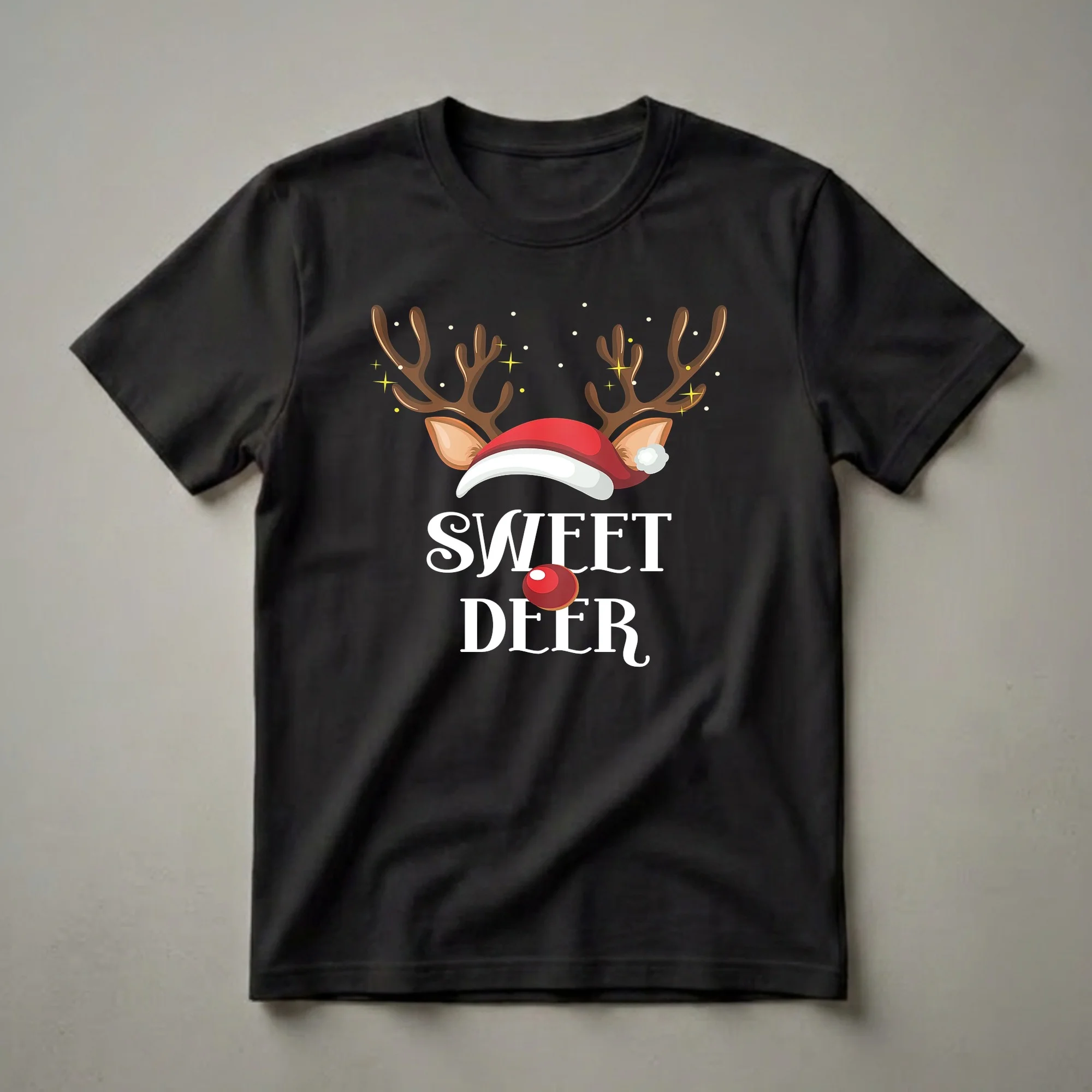 Families looking to coordinate their holiday attire will adore this festive 'Sweet Deer' t-shirt. The design features a whimsical reindeer head complete with brown antlers, a jolly red Santa hat adorned with a white pom-pom, and a bright red nose, reminiscent of Rudolph. Scattered white dots and yellow starbursts add a touch of winter magic and sparkle to the graphic. The words 'SWEET DEER' are prominently displayed in bold white lettering, making this shirt a fun and eye-catching choice for any Christmas celebration. This tee is a thoughtful gift for any family member who enjoys coordinating holiday outfits. It's a staple for Christmas morning photos, holiday parties, or even just cozying up by the fire. The design captures the playful spirit of the season, making it a go-to tee for creating lasting holiday memories. Imagine the joy of seeing your whole family dressed in these charming reindeer shirts, spreading holiday cheer wherever you go. This shirt is a wonderful way to embrace the festive spirit and make your Christmas celebrations even more memorable.
