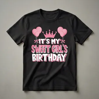 For the little girl celebrating a milestone birthday, this vibrant graphic tee announces the special occasion with festive flair. The design prominently features the phrase "IT'S MY SWEET GIRL'S BIRTHDAY" in bold, eye-catching pink and white lettering. Above the text, a playful pink crown sits atop the words, symbolizing royalty and celebration. Flanking the crown are clusters of pink balloons, adding a touch of whimsy and party atmosphere. This t-shirt is a wonderful way for a young girl to express her excitement on her big day. It's a thoughtful gift for parents, grandparents, aunts, or godparents looking for a special present for the birthday girl. Imagine her delight wearing this shirt to her birthday party, a family gathering, or even just for a fun birthday brunch. This shirt is a staple for any young girl's birthday wardrobe, ensuring she feels celebrated and special. It’s a go-to tee for creating memorable birthday photos and cherishing the moment.
