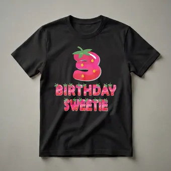 Three-year-old girls who love all things sweet and fruity will adore this vibrant birthday tee. The design prominently features a large, juicy strawberry shaped number '3', complete with green leaves and yellow seeds, embodying the fun and sweetness of a third birthday. Below the number, the words 'BIRTHDAY SWEETIE' are spelled out in playful, strawberry-themed letters, each adorned with its own leafy crown and seeds. This eye-catching graphic is a cheerful way to celebrate a special milestone. Strawberries, known for their bright red color and delicious taste, are a popular fruit among young children, making this shirt a hit for any little girl turning three. This t-shirt is a thoughtful gift for a daughter, niece, or granddaughter celebrating her third birthday. Imagine her delight wearing this to her birthday party, a family gathering, or even just for a fun day out. It's a wonderful way to make her feel extra special on her big day, capturing the joy and excitement of turning three.