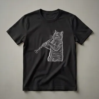 Musicians who play the clarinet will appreciate this striking graphic tee. The design features a detailed white line drawing of a tabby cat intently playing a clarinet. The cat's fur texture and whiskers are meticulously rendered, giving the artwork a classic, scratchboard feel. The clarinet itself is depicted with intricate keys and a flared bell, showcasing the instrument's elegance. The clarinet is a woodwind instrument known for its versatile tone, capable of producing both mellow and bright sounds, making it a staple in orchestras, concert bands, and jazz ensembles. This shirt is a thoughtful gift for any clarinet player, music student, or cat lover who also has a passion for music. It's a conversation starter at band practice, music lessons, or casual gatherings. Wear this unique t-shirt to express your dual interests in a stylish way. This apparel is a go-to tee for anyone who enjoys the unique combination of feline charm and musical artistry.