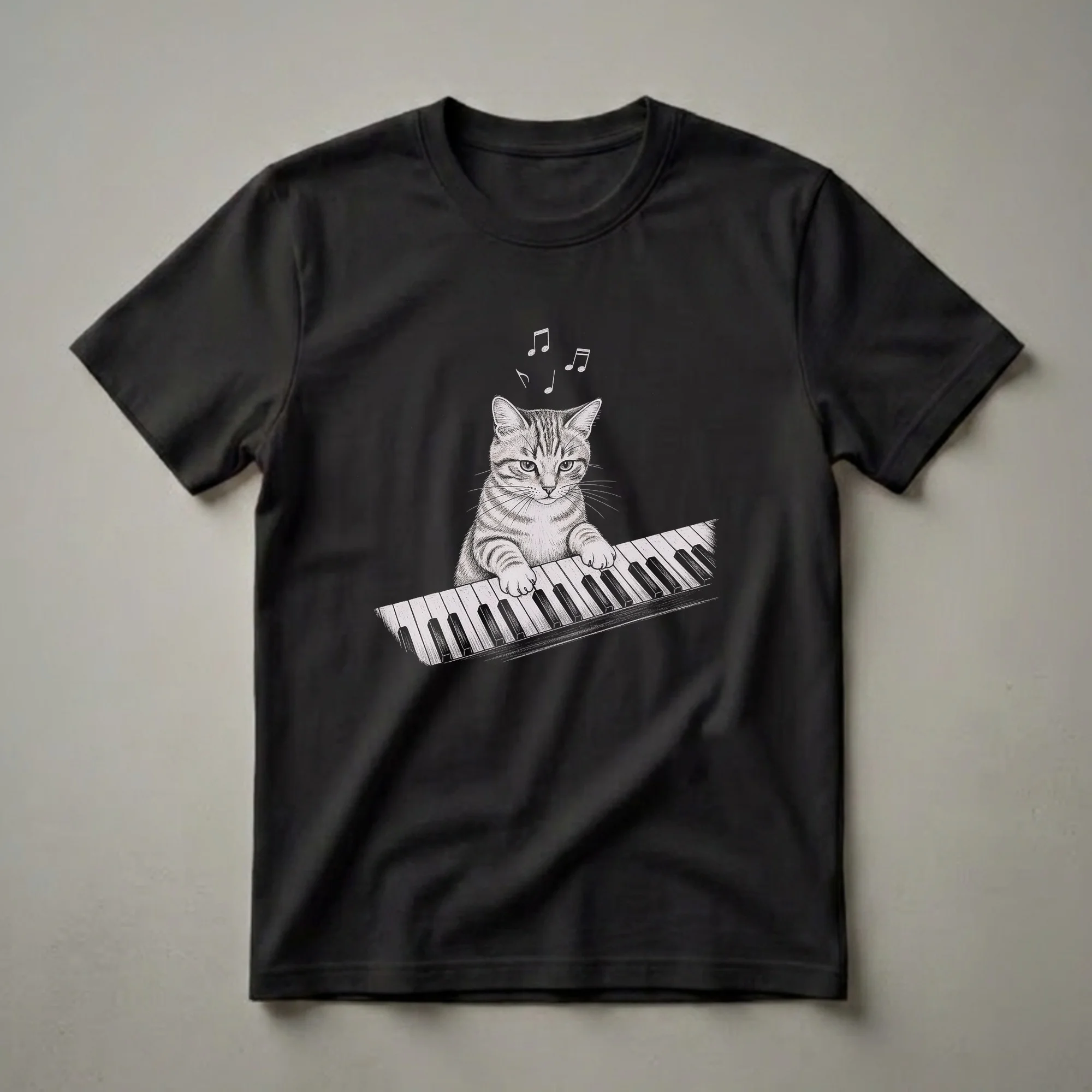 - A unique graphic tee for pianists, musicians, and cat lovers.