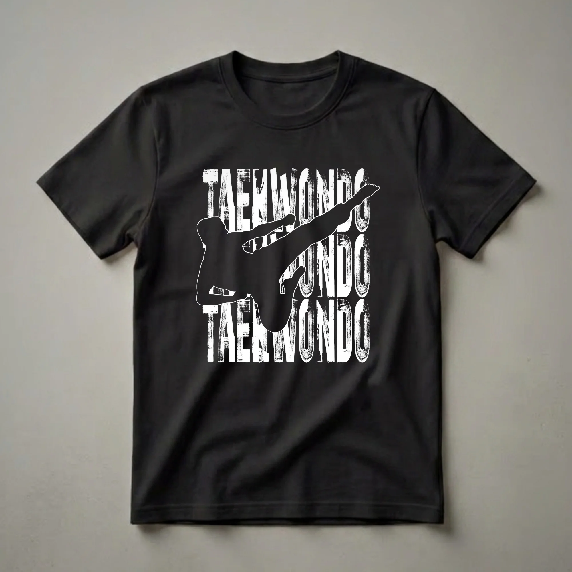 - Features a striking silhouette of a high kick with distressed 'TAEKWONDO' word art.