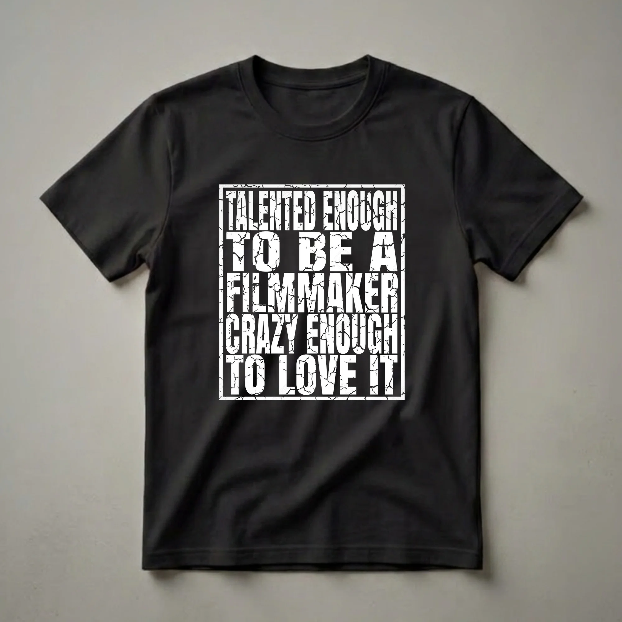 Filmmakers pour their hearts and souls into their craft, often balancing immense talent with an equally immense passion. This graphic tee captures that spirit, featuring bold white text with a distressed, cracked effect against a solid black background. The message reads, "TALENTED ENOUGH TO BE A FILMMAKER CRAZY ENOUGH TO LOVE IT." This shirt is a go-to for anyone who lives and breathes cinema, from aspiring directors to seasoned professionals. Filmmaking is a demanding yet incredibly rewarding field, requiring a unique blend of artistic vision and logistical prowess. The process of bringing a story to life on screen involves countless hours of planning, shooting, and editing, often under pressure. This tee celebrates the dedication and sheer love required to navigate the complexities of film production. It makes a thoughtful gift for the filmmaker in your life, whether they are working on their first short film or directing a feature-length production. Wear this shirt to set, to film festivals, or simply while enjoying a movie marathon, and let everyone know your commitment to the art of filmmaking.