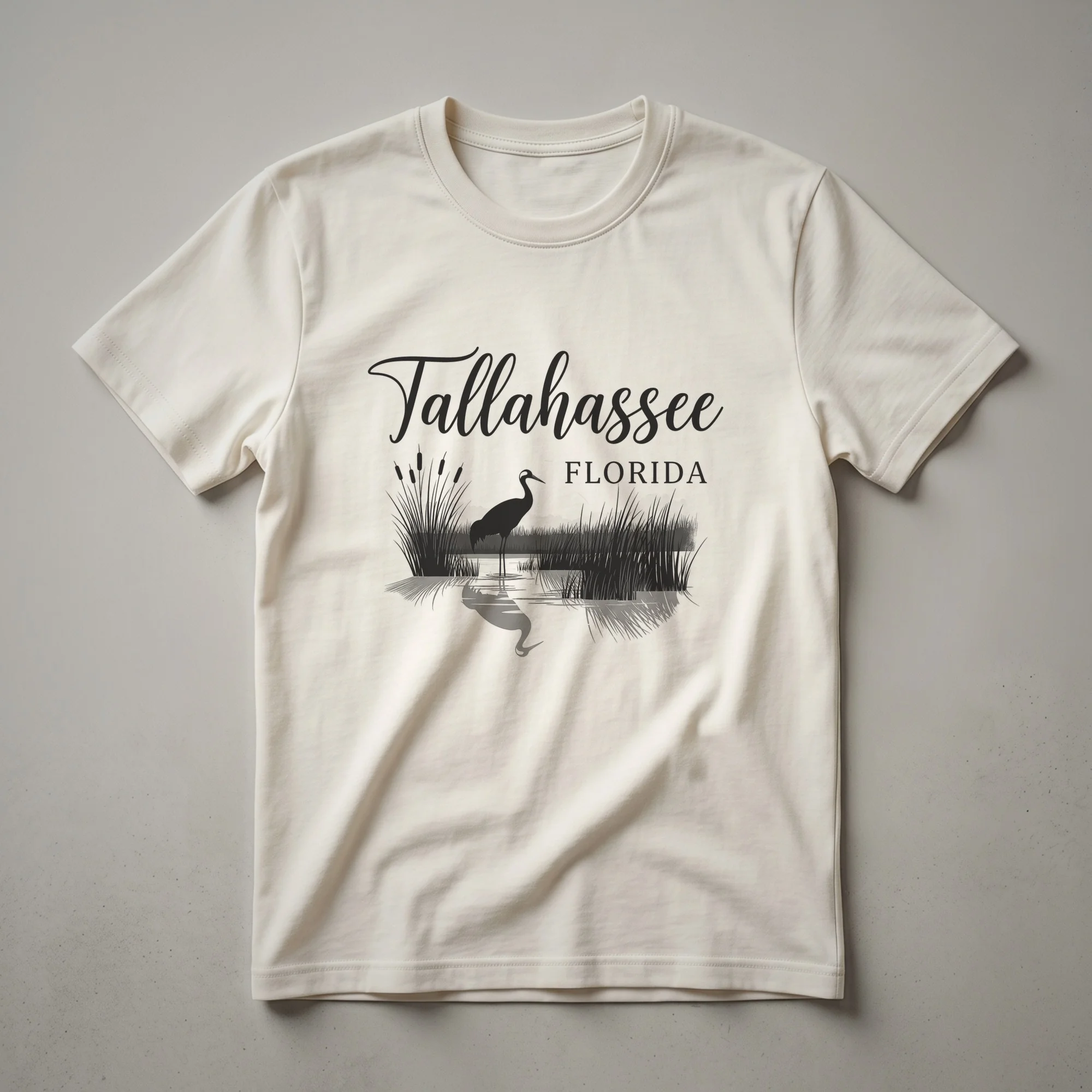 Tallahassee residents and visitors who appreciate the natural beauty of the Sunshine State will reach for this unique graphic tee. The design captures a tranquil marsh scene, complete with tall reeds, cattails, and a graceful wading bird, all rendered in a striking silhouette. The word "Tallahassee" is elegantly scripted above, with "FLORIDA" in a classic serif font below, grounding the image in its specific location. Florida's diverse ecosystems are home to numerous wading bird species, including herons and egrets, which are often spotted in the state's abundant wetlands and coastal areas. This shirt serves as a wearable reminder of the natural landscapes surrounding Florida's capital city. It makes a thoughtful gift for anyone who has lived in, visited, or dreams of returning to Tallahassee. Wear this comfortable t-shirt to casual outings, exploring local parks, or while reminiscing about your favorite Florida memories. It's a staple for your collection, celebrating the unique charm of Tallahassee.