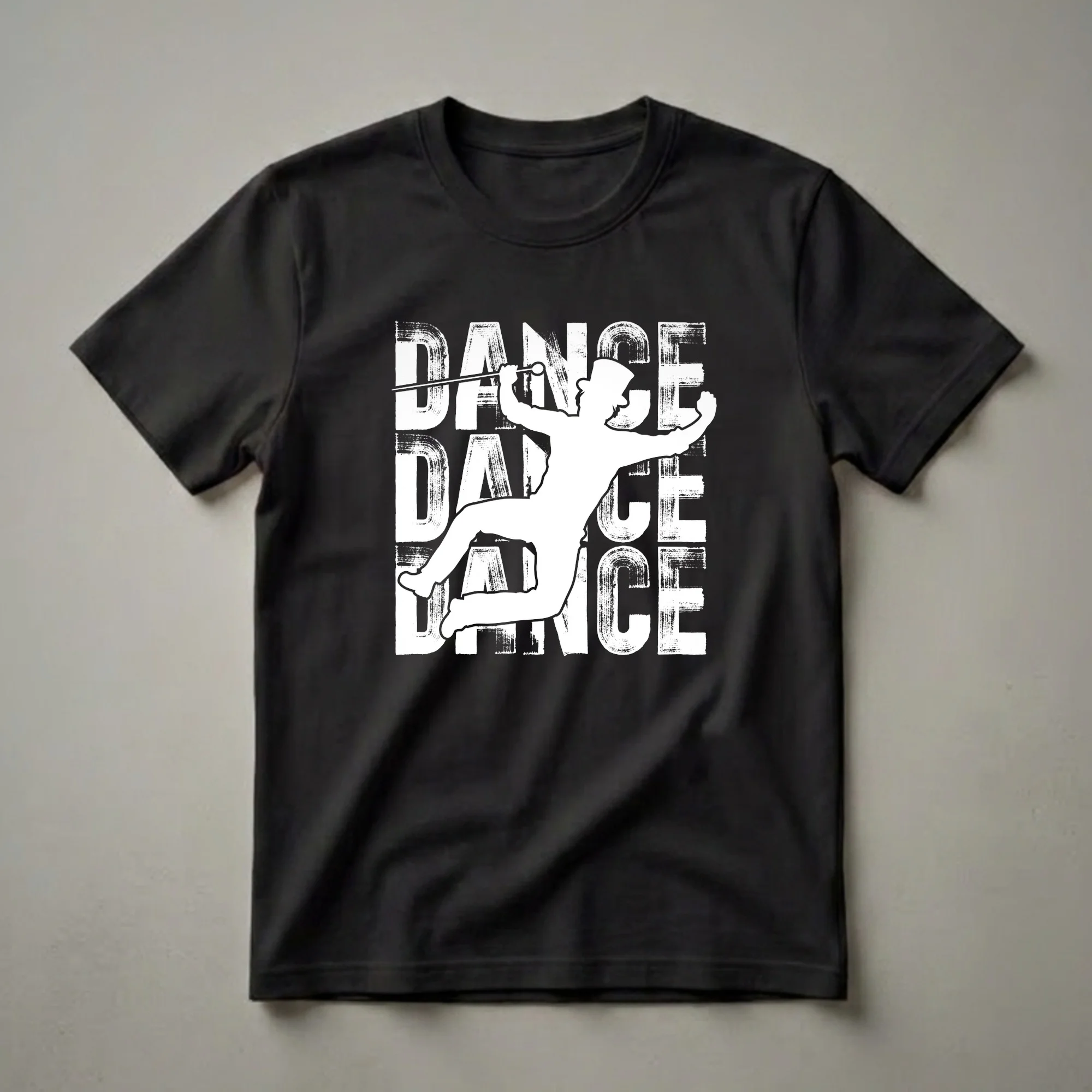 Tap dancers who live and breathe rhythm will appreciate this eye-catching graphic tee. The design features a dynamic white silhouette of a tap dancer captured mid-leap, holding a cane aloft, embodying the energy and athleticism of the art form. Behind the dancer, the word 'DANCE' is repeated in large, distressed white letters, creating a powerful visual statement. Tap dancing, known for its intricate footwork and percussive sounds, requires immense skill, coordination, and stamina, much like endurance sports. This shirt is a fantastic way for dancers to express their dedication to their craft. It makes a thoughtful gift for any tap dancer, whether they are a seasoned performer or just beginning their journey. Wear this t-shirt to dance class, rehearsals, or casual outings to showcase your love for tap. It's a staple in the collection for anyone who finds joy in the rhythmic expression of tap. This tee is a go-to for dancers who want to wear their passion proudly.