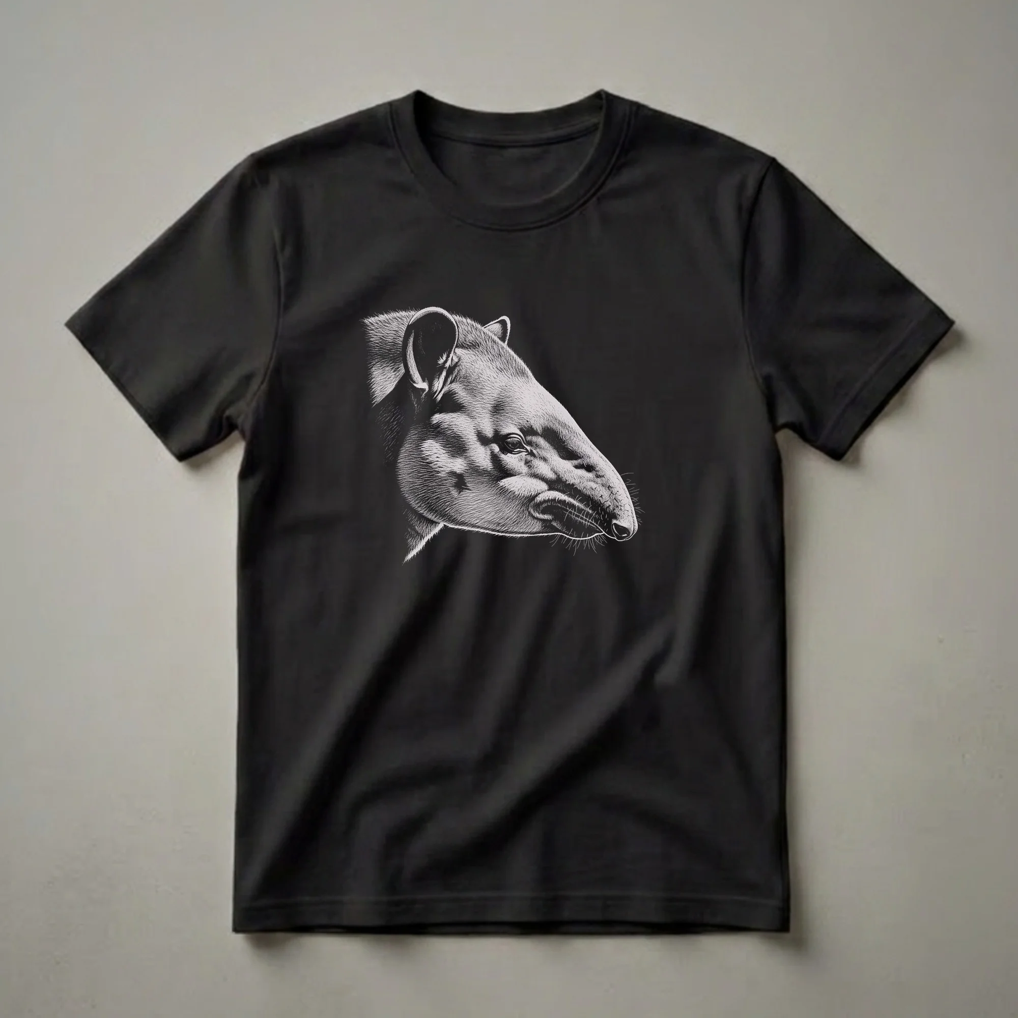 Wildlife enthusiasts and admirers of unique mammals will appreciate this striking t-shirt featuring a detailed scratchboard-style drawing of a tapir's head. The artwork captures the distinctive prehensile snout, large ears, and textured fur of the tapir with remarkable detail against a solid black background. Tapirs are fascinating, ancient mammals, often referred to as 'living fossils,' known for their shy nature and their role in seed dispersal within their rainforest and grassland habitats across Central and South America and Southeast Asia. This graphic tee is a conversation starter, a thoughtful choice for hikers, nature photographers, or anyone who appreciates the intricate beauty of the animal kingdom. It makes a thoughtful gift for the wildlife lover in your life who seeks apparel that stands out. Wear this unique tapir shirt to your next nature walk or casual outing to express your passion for these incredible creatures. This shirt is a go-to for anyone who loves unique animal art.