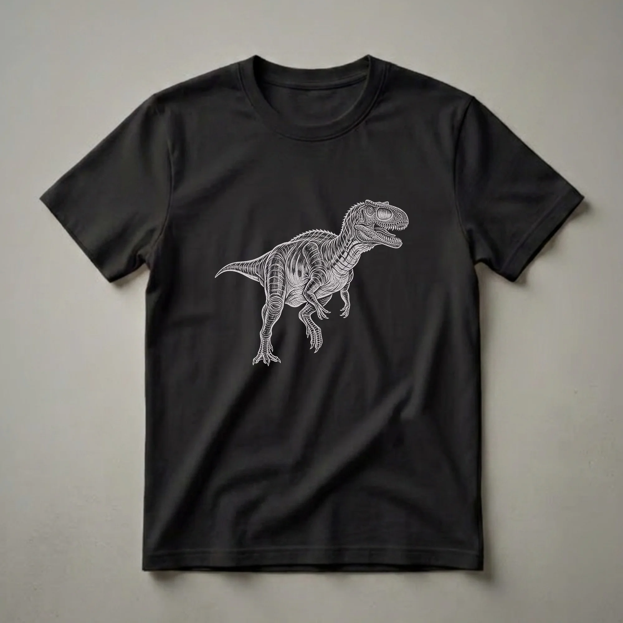 Tarbosaurus bataar, a fearsome theropod dinosaur, roamed Asia during the Late Cretaceous period, approximately 70 million years ago. This striking graphic tee features a detailed, vintage-style line drawing of the Tarbosaurus, capturing its powerful build and sharp teeth. The intricate linework highlights the dinosaur's musculature and reptilian scales, presented in a classic white-on-black design that evokes a sense of ancient history. This shirt is a thoughtful gift for any paleontology enthusiast, dinosaur aficionado, or anyone fascinated by the prehistoric world. Wear this unique t-shirt to a museum visit, a casual outing, or to share your passion for these magnificent ancient reptiles. It's a staple in the collection for those who appreciate detailed wildlife art and the study of extinct species. This eye-catching apparel makes a statement about your interest in the natural history of our planet.