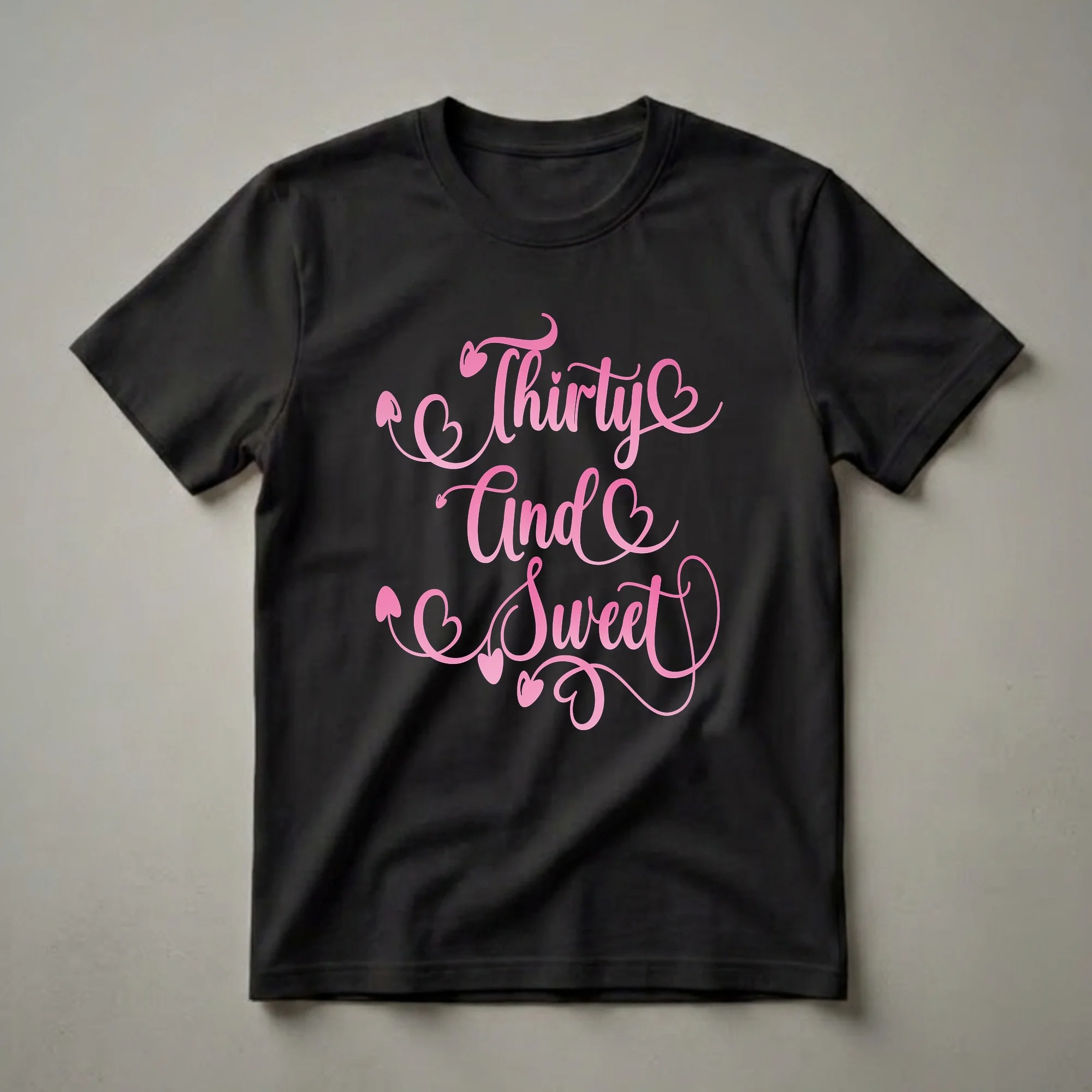 Turning thirty is a significant milestone, and this "Thirty And Sweet" graphic tee captures the celebratory spirit. The design features elegant pink script lettering that reads "Thirty And Sweet," adorned with playful hearts and decorative swirls, all set against a classic black background. This t-shirt is a wonderful way for women to express their excitement as they enter a new decade. It’s a staple in any collection for those celebrating their 30th birthday, offering a blend of chic style and personal significance. This shirt works well for birthday brunches, parties, or casual wear throughout the year. Looking for a thoughtful gift for the woman in your life who is turning 30? This eye-catching tee is a fantastic choice, offering a unique way to commemorate her special day. She will reach for this shirt to showcase her milestone birthday with pride and flair. It's more than just apparel; it's a statement piece for a new chapter.
