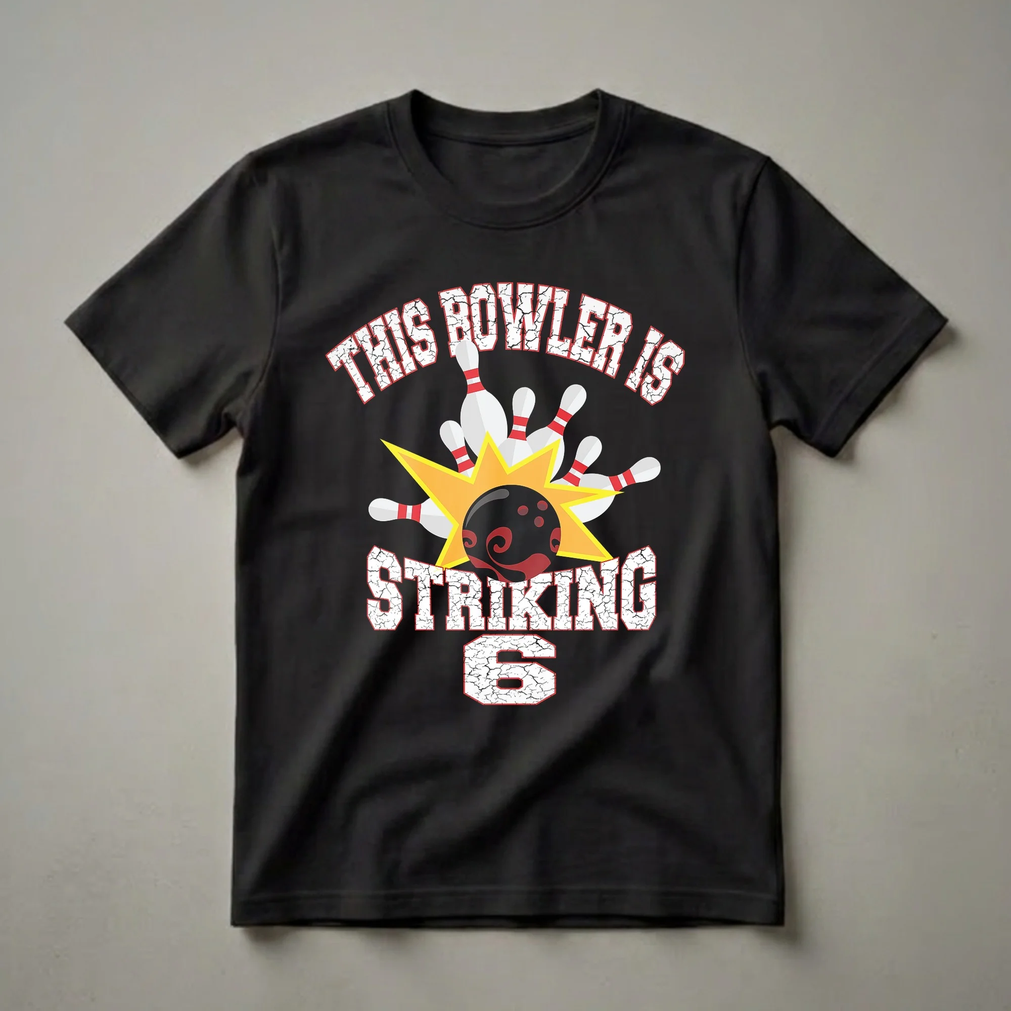 Six-year-olds are entering a vibrant stage of childhood, full of energy and new discoveries. This graphic tee celebrates a special milestone: turning six with a bowling theme. The design features bold, cracked-texture white lettering that reads "THIS BOWLER IS STRIKING" across the top, with a dynamic graphic of a black bowling ball with red swirls impacting a set of white bowling pins. A bright yellow starburst shape emanates from the impact zone, emphasizing the action. Below the pins, the number "6" is prominently displayed in the same distressed white font, signifying the birthday age. Bowling is a sport enjoyed by many families, offering a fun activity for kids and adults alike. This shirt is a thoughtful gift for any child celebrating their sixth birthday who enjoys the excitement of knocking down pins. It's a fantastic way for them to show off their age and their love for the game, whether they're hitting the lanes for a birthday party or just playing a casual game. This t-shirt makes a thoughtful gift and a memorable keepsake from their special day. Imagine their excitement wearing this eye-catching bowling shirt to their birthday celebration or a day at the bowling alley.