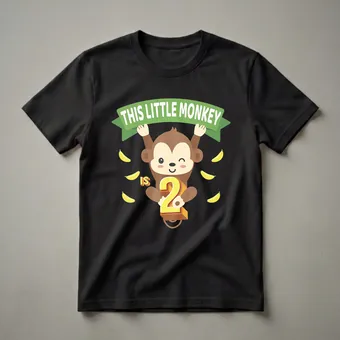 Two-year-olds are entering a phase of incredible discovery and playful energy, making this 'This Little Monkey' birthday tee a perfect fit for their celebration. The graphic showcases a cheerful cartoon monkey, complete with rosy cheeks and a playful wink, hanging from a green banner that proudly proclaims 'THIS LITTLE MONKEY'. This little primate is holding a large, bright yellow number '2', signifying the milestone birthday. Surrounding the monkey are several ripe bananas, adding to the jungle theme and appealing to a young child's imagination. Monkeys are known for their agility and curiosity, traits that often emerge as toddlers turn two. This t-shirt is worn by any child celebrating their second birthday, offering a fun and memorable way to mark the occasion. It makes a thoughtful gift for a grandson, niece, or any special 2-year-old in your life who loves animals. Imagine them wearing this vibrant shirt to their birthday party, a family gathering, or even just for a fun day out, bringing smiles to everyone around.