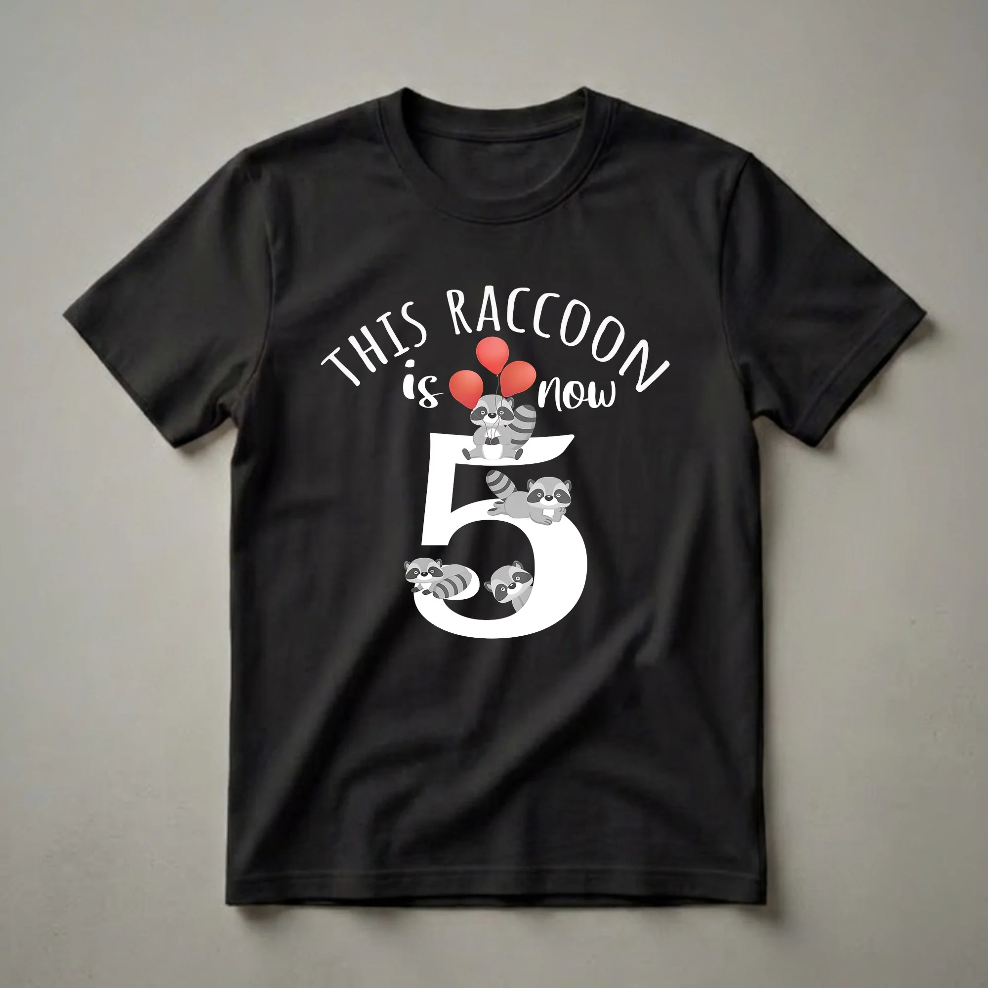 - A fun, festive t-shirt for a boy or girl celebrating their fifth year with a playful raccoon design.