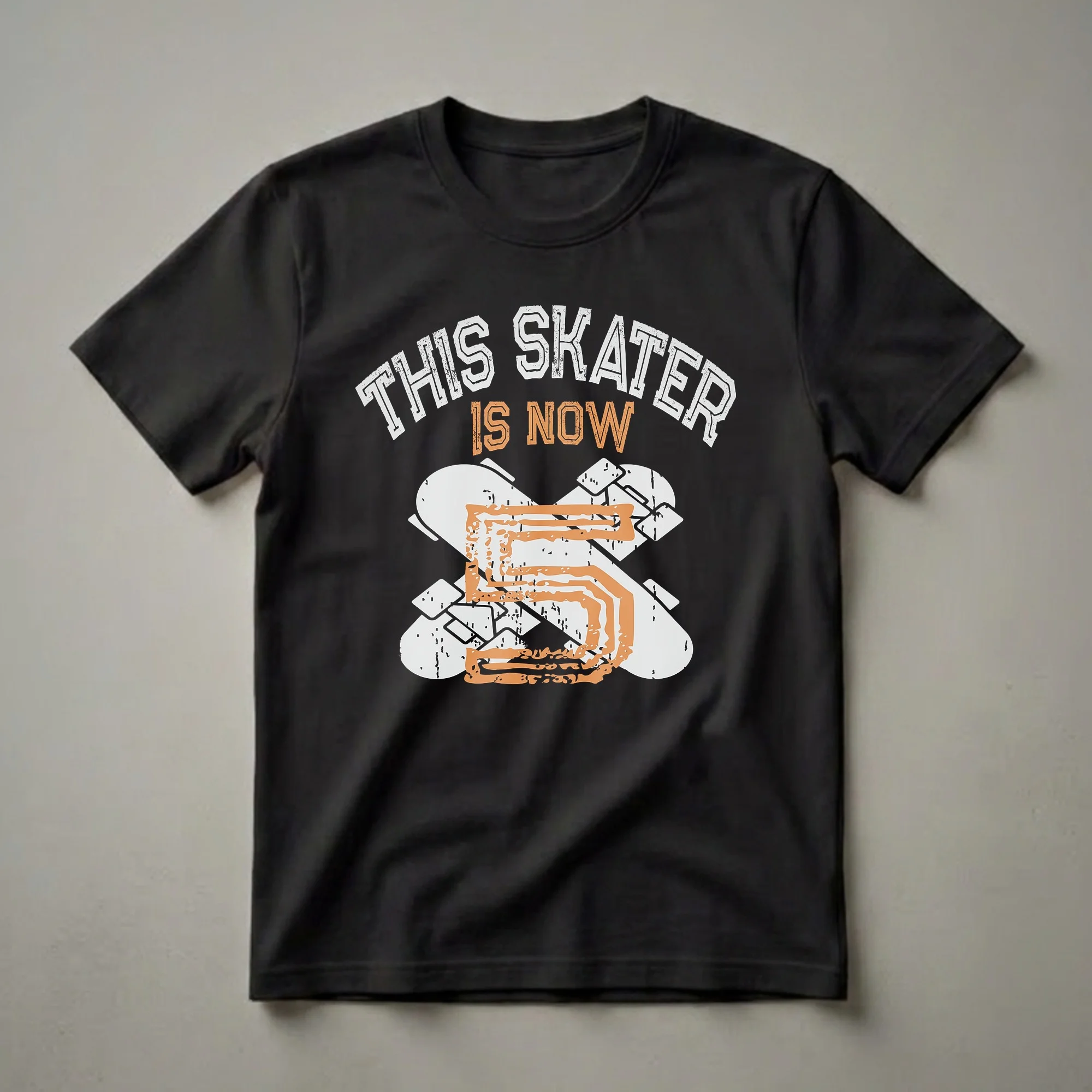 Turning five is a major milestone, and this "This Skater Is Now 5" graphic t-shirt is the ideal way for a young skateboarder to celebrate their special day. The design features bold, distressed lettering that reads "THIS SKATER IS NOW 5" in white and orange, layered over two crossed skateboards. The skateboards themselves are depicted in a light grey with a distressed texture, adding a cool, worn-in vibe that resonates with skate culture. The number "5" is prominently displayed in a large, stylized orange font, emphasizing the birthday age. This eye-catching tee is made for active kids who are passionate about skateboarding, whether they are just learning tricks or already shredding at the local skate park. It’s a fantastic birthday shirt for any child turning five who dreams of ollies and kickflips. This shirt makes a thoughtful gift for a son, daughter, niece, or nephew who is celebrating their fifth birthday and loves to skate. Imagine their excitement unwrapping this unique piece of apparel, ready to wear it to their birthday party or their next skate session. It’s a fun way to showcase their age and their passion for skateboarding all at once, making their fifth birthday even more memorable.