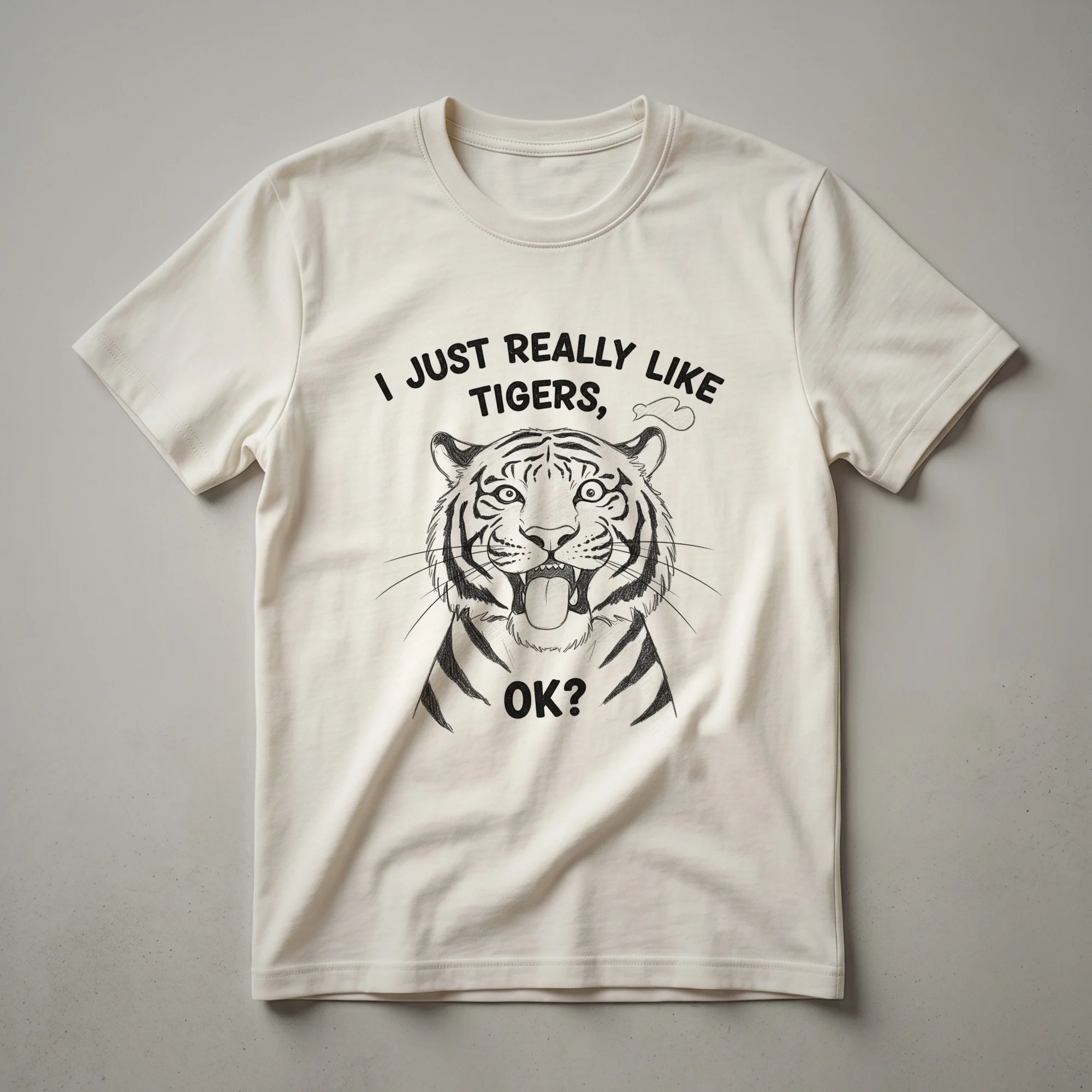 - Features a bold tiger face design with the text 'I Just Really Like Tigers, Ok?'.