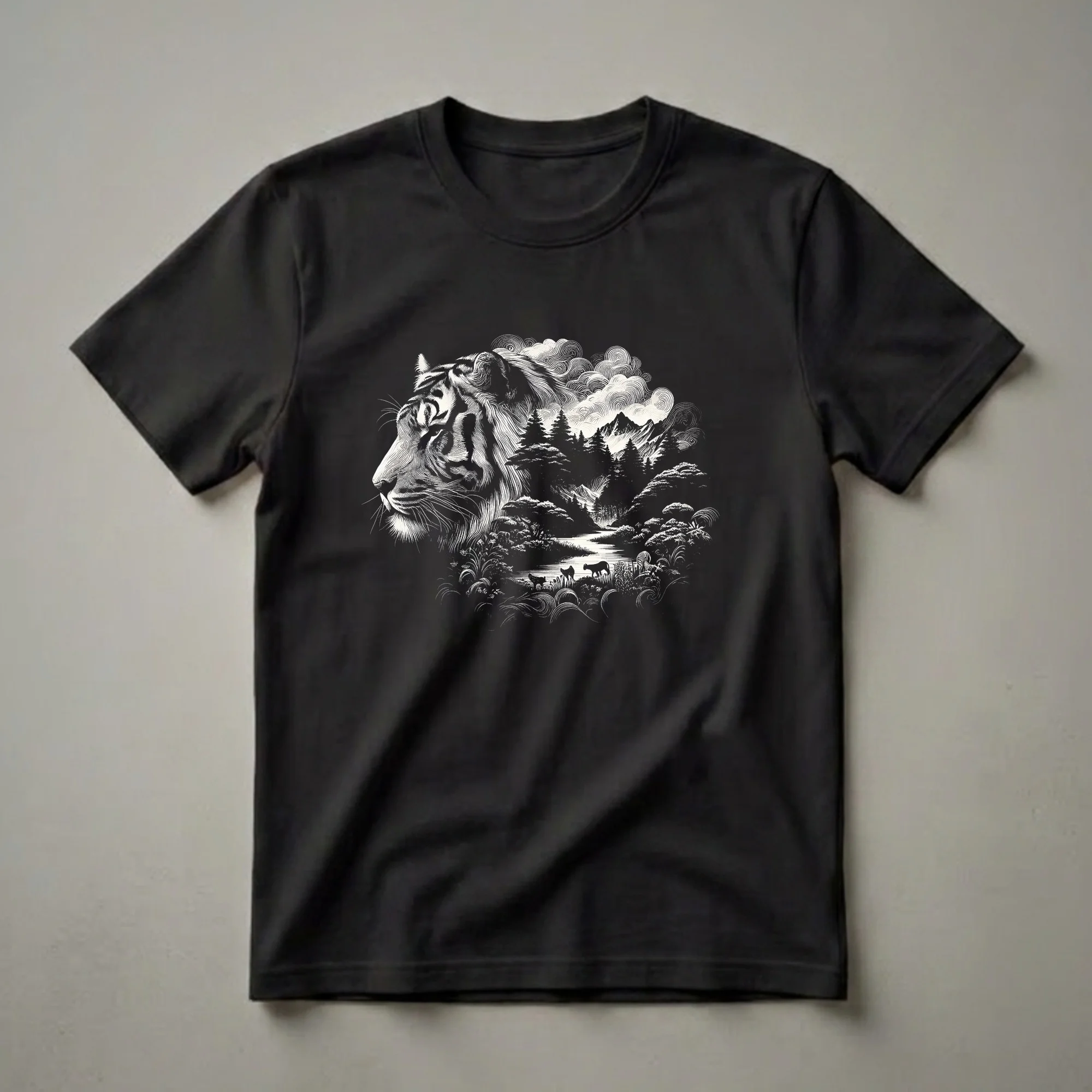 Wildlife enthusiasts who appreciate the majestic beauty of big cats will reach for this unique graphic tee. The design features a detailed, linework illustration of a tiger's head that seamlessly blends into a serene woodland scene. This natural landscape includes a winding river, dense pine trees, and majestic mountains under a sky filled with swirling clouds. Small silhouettes of other animals, possibly deer or smaller predators, can be seen near the water's edge, adding a sense of life to the wilderness. Tigers, the largest of all cat species, are apex predators native to Asia, known for their distinctive orange fur with black stripes. They inhabit diverse environments, from tropical rainforests to grasslands and savannas, playing a crucial role in maintaining ecosystem balance. This t-shirt is a thoughtful gift for anyone who admires these powerful creatures and the natural world they inhabit. Wear this shirt on your next hike, to a nature documentary screening, or simply as a statement piece that celebrates the wild. It's a staple for any nature lover's wardrobe, offering a unique artistic representation of the untamed spirit.