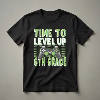 Kids entering 6th grade are embarking on a significant academic milestone, transitioning into middle school and a new phase of their education. This "Time to Level Up" graphic tee captures that excitement with a vibrant video game theme. The design features bold, gradient green lettering that reads "TIME TO LEVEL UP" above a realistic illustration of a black video game controller with green accents. Below the controller, more green lettering proclaims "6TH GRADE," set against a backdrop of green polka dots. This shirt is a fantastic way for any child to express their passion for gaming while celebrating their advancement. It makes a thoughtful gift for any 6th grader who loves video games, whether they are celebrating a birthday or just the start of the school year. This t-shirt is a go-to choice for casual wear, school events, or birthday parties, allowing kids to showcase their gamer identity. The transition to 6th grade is a big deal, and this shirt helps them wear their achievement with pride and a touch of fun.