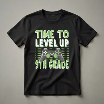Ninth grade marks a significant transition, and this graphic tee captures that excitement with a vibrant video game theme. The design features bold, gradient green lettering that reads 'TIME TO LEVEL UP' across the top, immediately signaling a new challenge or stage. Below this, a realistic black video game controller with green accents is prominently displayed, symbolizing the digital worlds many students navigate. The phrase '9TH GRADE' is emblazoned at the bottom in similar green lettering, clearly identifying the milestone. This shirt is a natural fit for any child, particularly boys and girls entering their freshman year, who are passionate about gaming and see this academic step as a new level to conquer. It makes a thoughtful gift for a child celebrating their 9th-grade birthday or simply as a way to acknowledge their academic achievement. Imagine them wearing this t-shirt to a birthday party or a casual get-together with friends, showcasing their gamer identity and their pride in reaching this new grade level. This tee is a fun way for kids to express their personality and interests as they embark on their high school journey.