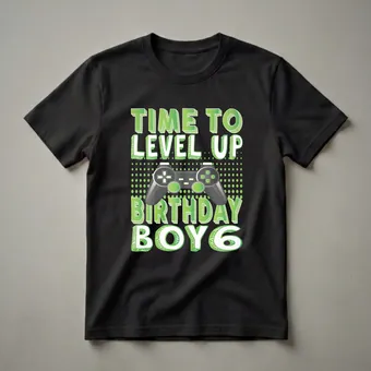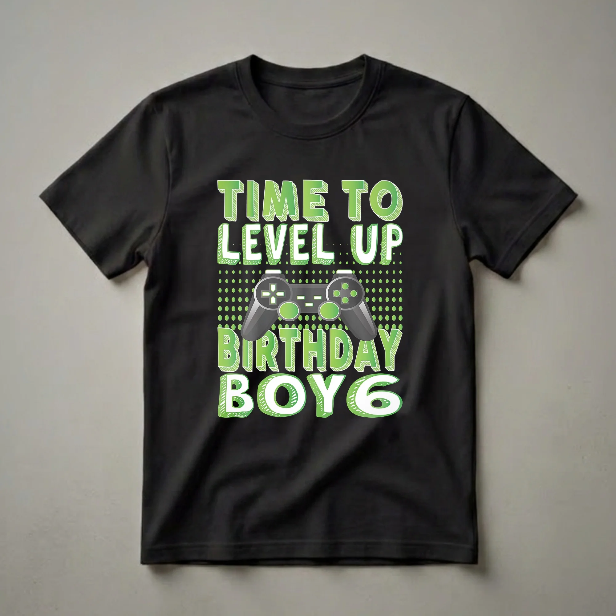 - "Time to Level Up Birthday Boy 6" graphic tee for a 6-year-old.