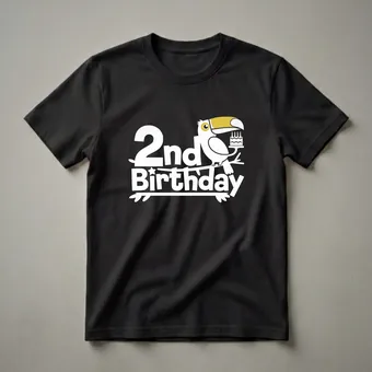 Two-year-olds are exploring the world with boundless energy, and this vibrant t-shirt captures that spirit. The design features a cheerful white toucan with a striking yellow beak, perched on a branch. This tropical bird is holding a small birthday cake adorned with four lit candles, ready to celebrate a special milestone. The words '2nd Birthday' are presented in bold white lettering, making it clear this shirt is for a very important occasion. Toucans are known for their large, colorful beaks and their habitat in tropical rainforests, adding an exotic touch to this festive apparel. This graphic tee is a wonderful way for a two-year-old to show off their age on their big day. It makes a thoughtful gift for any child turning two, a thoughtful choice for birthday parties, family gatherings, or just everyday wear. This shirt is a fun addition to any toddler's wardrobe, celebrating their second year with a touch of jungle flair. This eye-catching shirt is sure to be a hit with the birthday boy or girl.