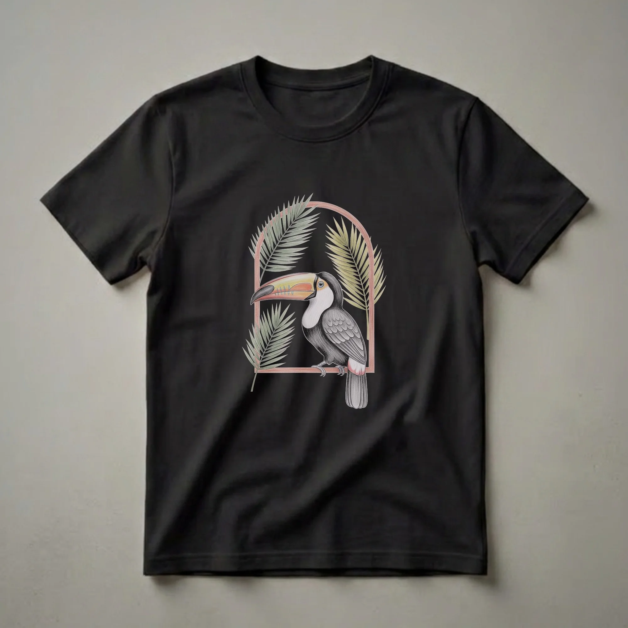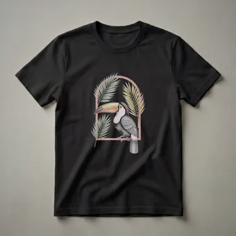 Nature lovers and birdwatchers will appreciate this striking t-shirt featuring a detailed, vintage-style drawing of a toucan. The artwork showcases a toucan perched on a branch, framed by a rustic arch and complemented by lush palm leaves. Toucans are known for their vibrant, oversized bills and are native to the tropical rainforests of Central and South America, where they play a crucial role in seed dispersal. This graphic tee captures the exotic beauty of these fascinating birds, making it a unique addition to any nature enthusiast's wardrobe. The intricate colored pencil style drawing evokes a sense of nostalgia and appreciation for the natural world. This shirt works well for casual outings, nature walks, or as a thoughtful gift for anyone who admires tropical birds and botanical art. It's a go-to tee for expressing a passion for wildlife and the beauty of the rainforest ecosystem. Wear it to your next birdwatching expedition or simply to add a touch of the tropics to your everyday style.