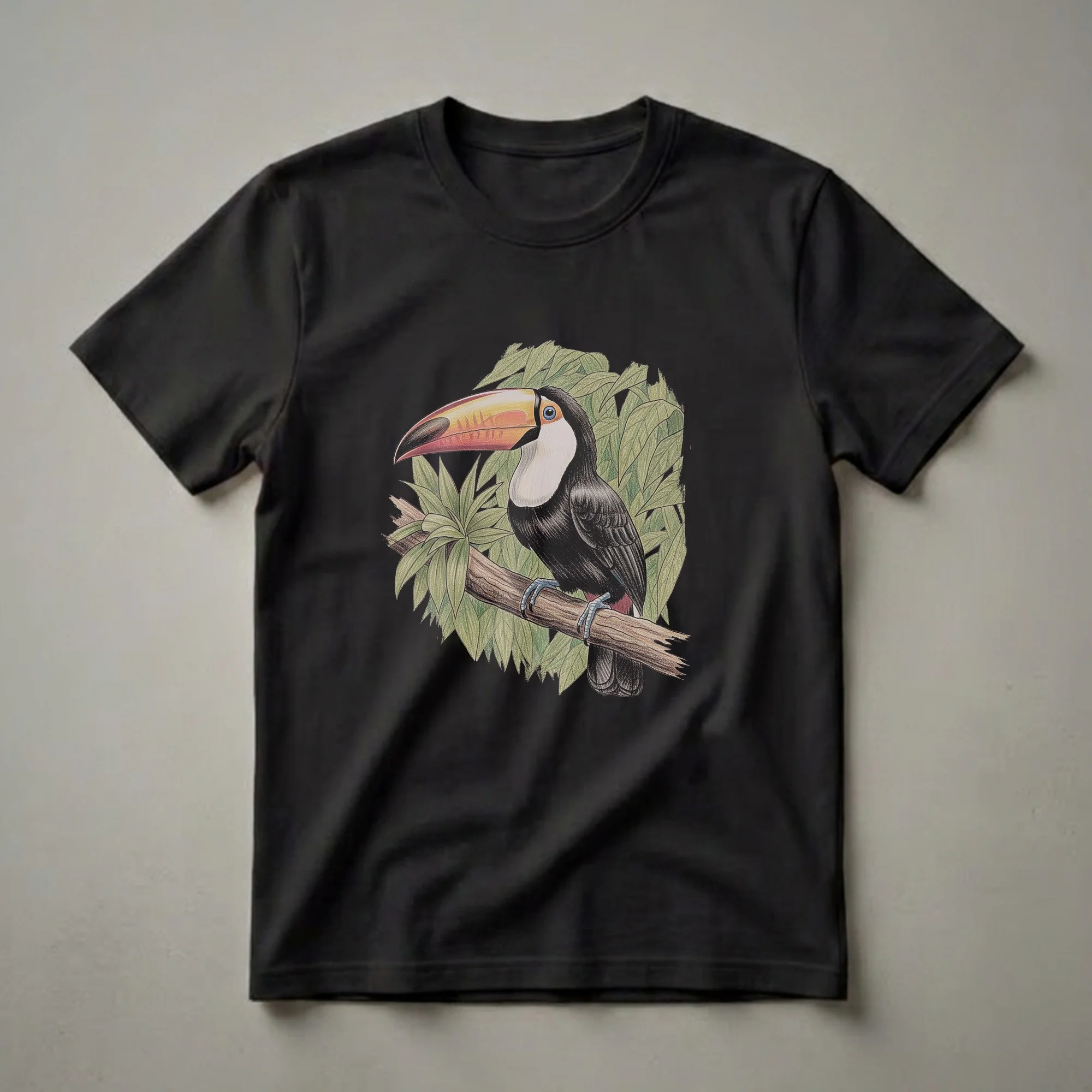 Nature lovers and bird watchers will appreciate this eye-catching t-shirt featuring a detailed drawing of a toucan. The artwork depicts a vibrant toucan perched on a weathered branch, its iconic large beak prominently displayed. Lush green leaves frame the scene, evoking a tropical rainforest habitat. Toucans are known for their distinctive colorful bills, which they use for a variety of purposes, including thermoregulation and attracting mates. This graphic tee is a wonderful way for bird enthusiasts to express their passion for wildlife. It makes a thoughtful gift for anyone who admires the beauty of tropical birds and the natural world. Wear this unique shirt to your next nature walk or casual outing to spark conversations about avian wonders. This t-shirt is a staple for anyone who enjoys unique animal art.