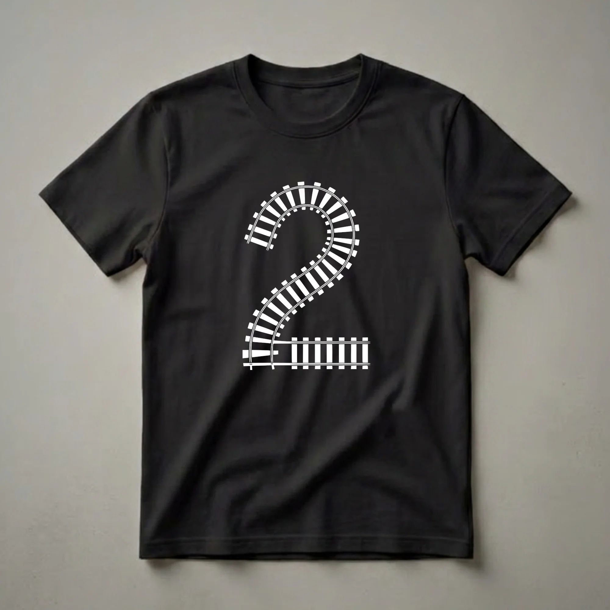 Two-year-old boys who are fascinated by trains will love this unique birthday tee. The graphic features a bold white number '2' constructed entirely from train tracks, complete with sleepers and rails, curving across the shirt. This design captures the excitement of a railroad journey, making it a standout choice for a second birthday celebration. Trains have been a vital part of transportation and industry for centuries, and their enduring appeal continues to captivate young minds. This shirt is a thoughtful gift for any two-year-old boy celebrating this milestone. It's a fun way for him to show off his love for locomotives and all things railway. Imagine him wearing this eye-catching shirt to his birthday party or on a special outing, bringing smiles to everyone around. This t-shirt is a wonderful way to commemorate his second year, combining a popular theme with a festive occasion. It's a staple for any toddler's wardrobe who dreams of chugging along the tracks.