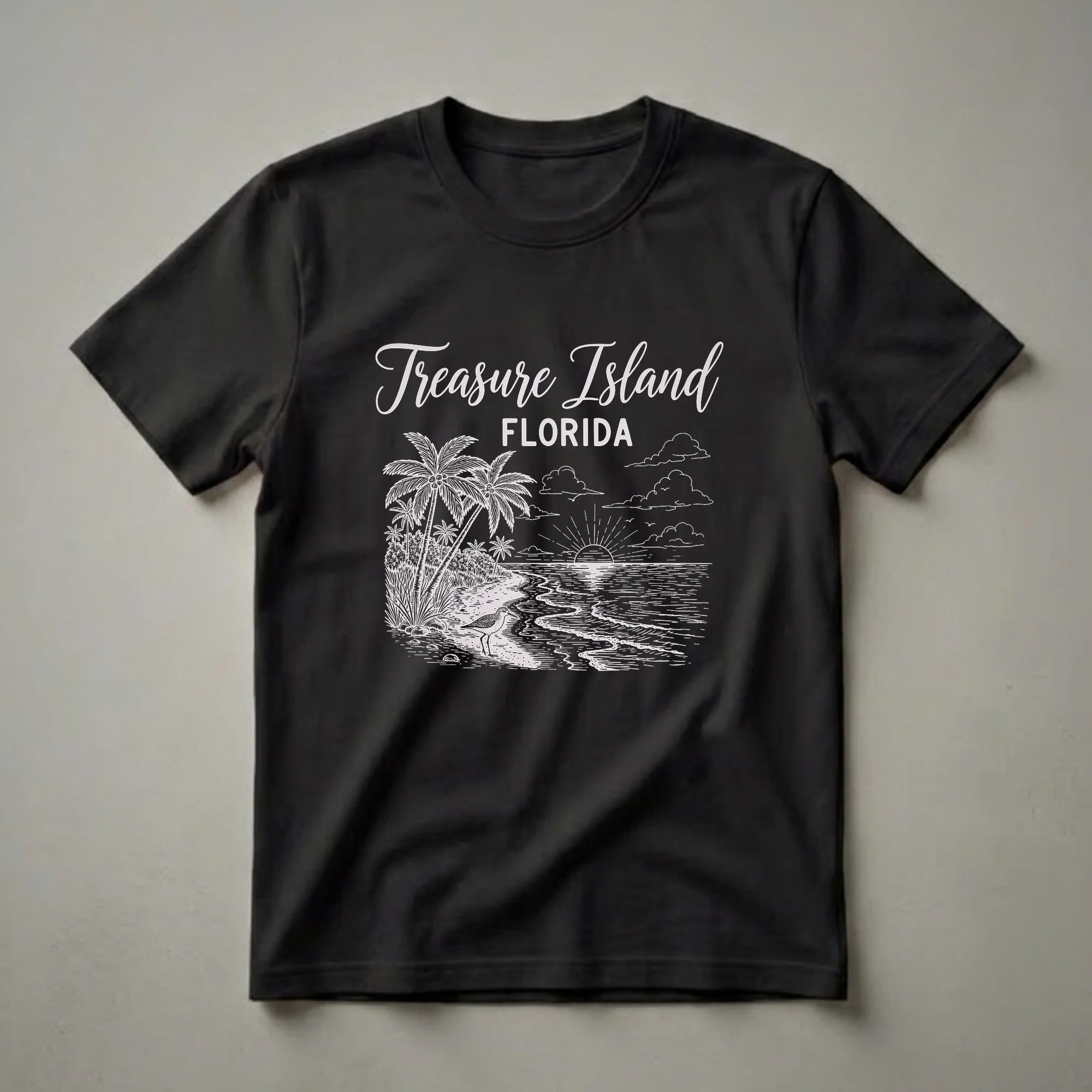 Treasure Island, Florida, beckons with its sun-drenched beaches and vibrant coastal charm. This graphic t-shirt captures that essence with a striking sketch-style design. The artwork depicts a serene beach scene, complete with swaying palm trees on the left, a lone shorebird standing by the water's edge, and a radiant sunset casting its glow over the ocean waves. The sky is dotted with stylized clouds, adding to the picturesque view. Treasure Island is a barrier island located in Pinellas County, Florida, known for its beautiful white-sand beaches and calm Gulf waters, making it a popular destination for vacationers and snowbirds alike. This tee is a thoughtful gift for anyone who has visited or dreams of visiting this popular Florida locale. Wear this shirt to remember your Florida vacation or to showcase your state pride. It's a comfortable and stylish way to carry a piece of the Sunshine State with you, whether you're strolling along the beach or exploring local shops. This unique graphic tee serves as a wonderful memento of your time spent in this coastal paradise.