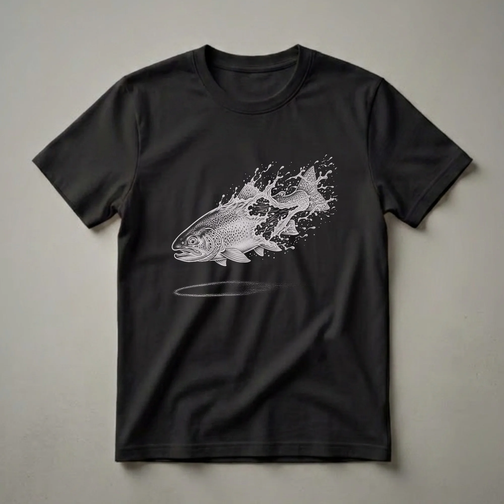 Anglers and outdoor enthusiasts will appreciate the dynamic artistry of this trout graphic tee. The detailed drawing captures a trout mid-leap, breaking through a splash of water with remarkable realism. This shirt is a tribute to the beauty of freshwater game fish, known for their agility and vibrant patterns. Trout, belonging to the Salmonidae family, are found in cool, clear streams and lakes across the globe, making them a prized catch for sport fishermen. This t-shirt is a staple for anyone who loves fly fishing, stream fishing, or simply enjoys the serene beauty of aquatic wildlife. It makes a thoughtful gift for the fisherman in your life who spends weekends by the river or lake. Wear this tee on your next fishing trip or casual outing to express your connection to the wild.