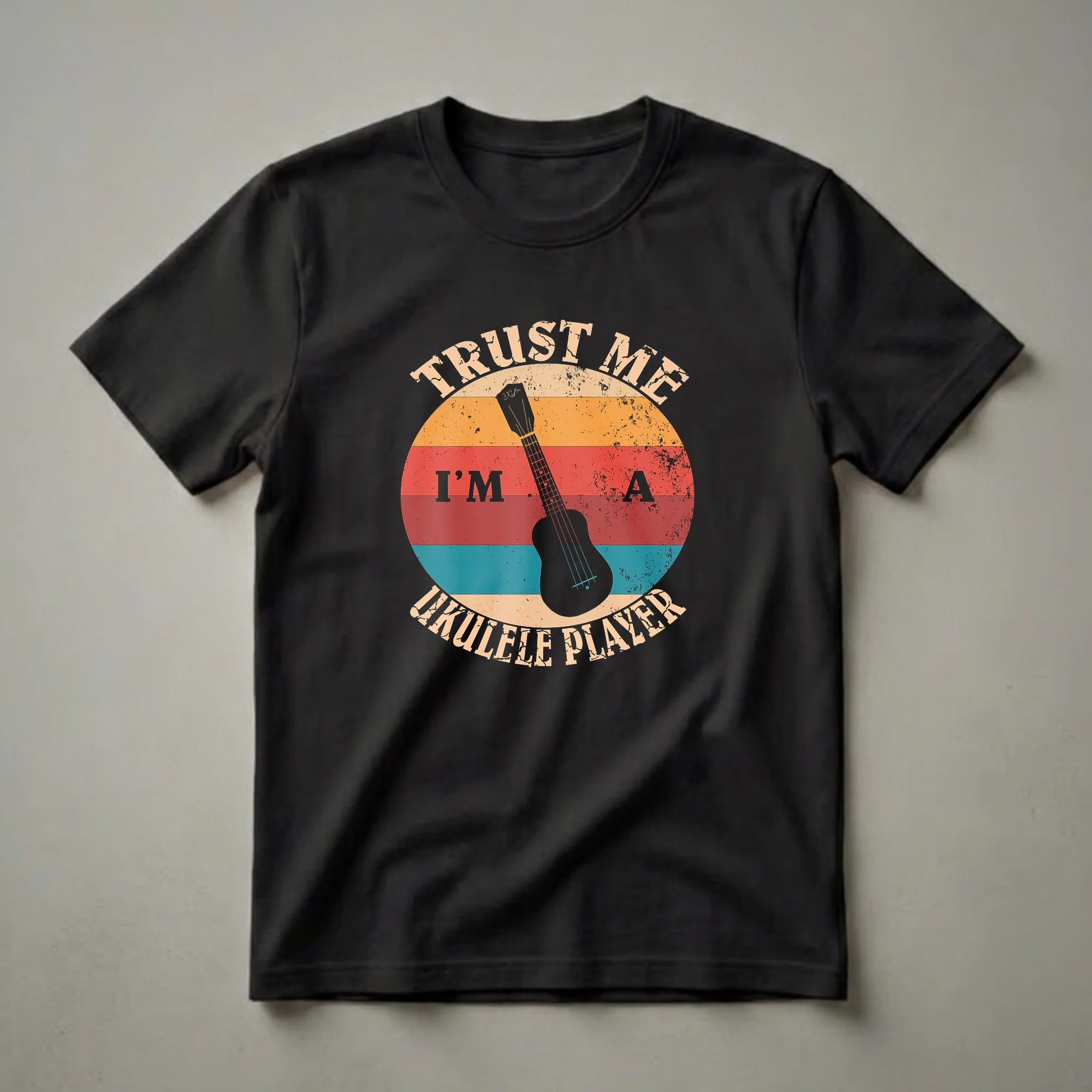 Ukulele players know the joy of strumming this four-stringed instrument, often associated with Hawaiian music and a relaxed island vibe. This graphic tee captures that spirit with a striking retro sunset design. The silhouette of a ukulele is prominently featured against a backdrop of horizontal stripes in warm, faded colors like orange, red, and cream, all overlaid with a distressed texture for a vintage feel. Bold, cracked lettering arches over the top and bottom, proclaiming "TRUST ME" and "UKULELE PLAYER," with "I'M A" placed centrally. This shirt is a fantastic way for any ukulele enthusiast to express their musical identity. It makes a thoughtful gift for the musician in your life, whether they are a beginner just learning their first chords or a seasoned player who performs at local gatherings. This comfortable tee is a go-to for casual wear, jam sessions, or attending music festivals. It’s a staple for anyone who loves the cheerful sound of the ukulele and wants to share their passion with the world.