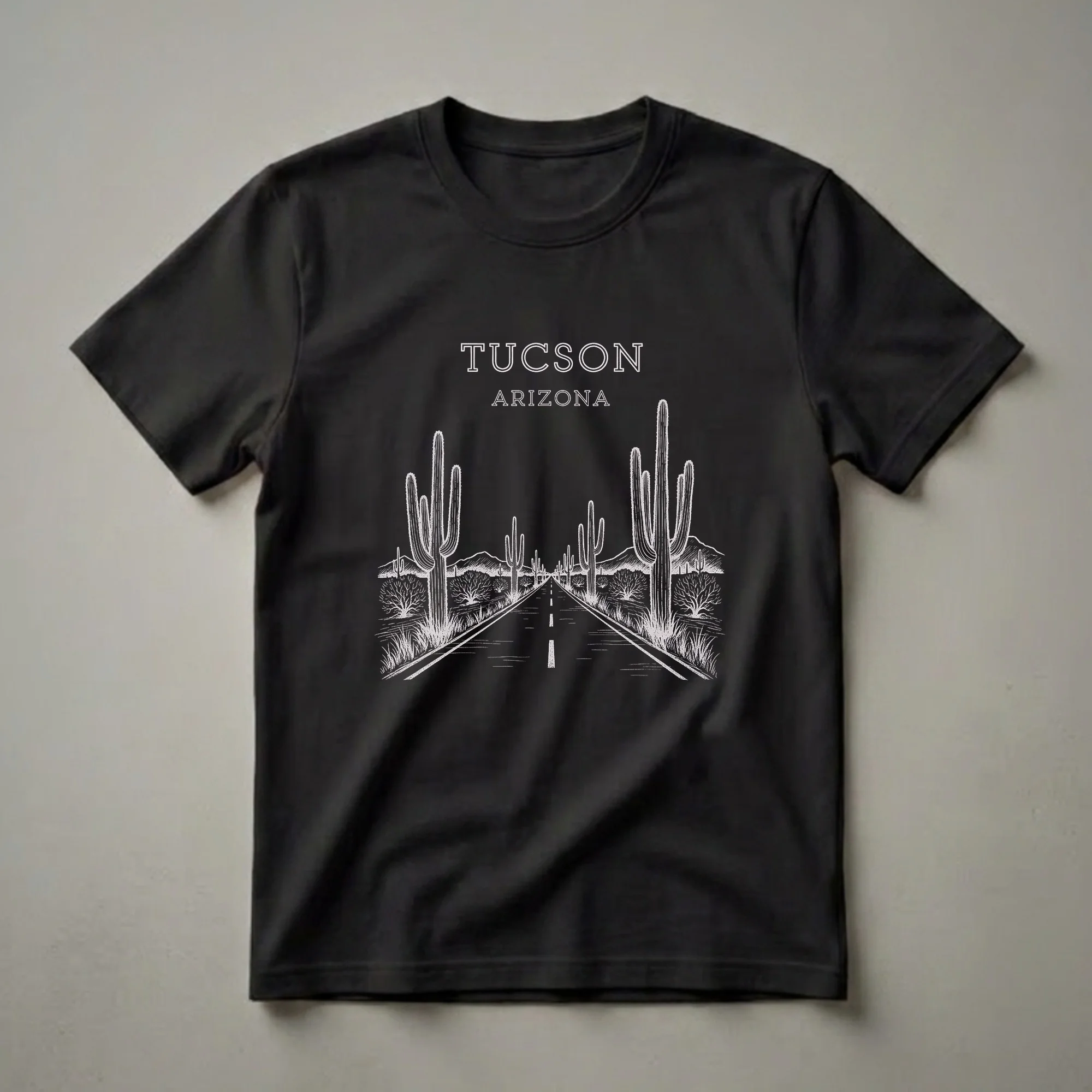 Tucson Arizona owners who want to wear their love for the Sonoran Desert will reach for this unique graphic tee. The design showcases a classic desert scene, with a straight road stretching towards the horizon, lined by iconic saguaro cacti and arid brush. In the distance, mountains rise against the sky, rendered in a detailed sketch art style. Tucson, located in the Sonoran Desert, is known for its stunning natural beauty and vibrant desert vistas. This t-shirt captures that essence, making it a thoughtful gift for anyone who has a connection to this beautiful Arizona city. Wear this shirt to remember your travels or to celebrate your home. It's a comfortable and stylish way to showcase your appreciation for the American Southwest.