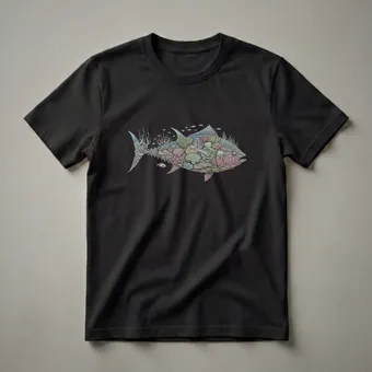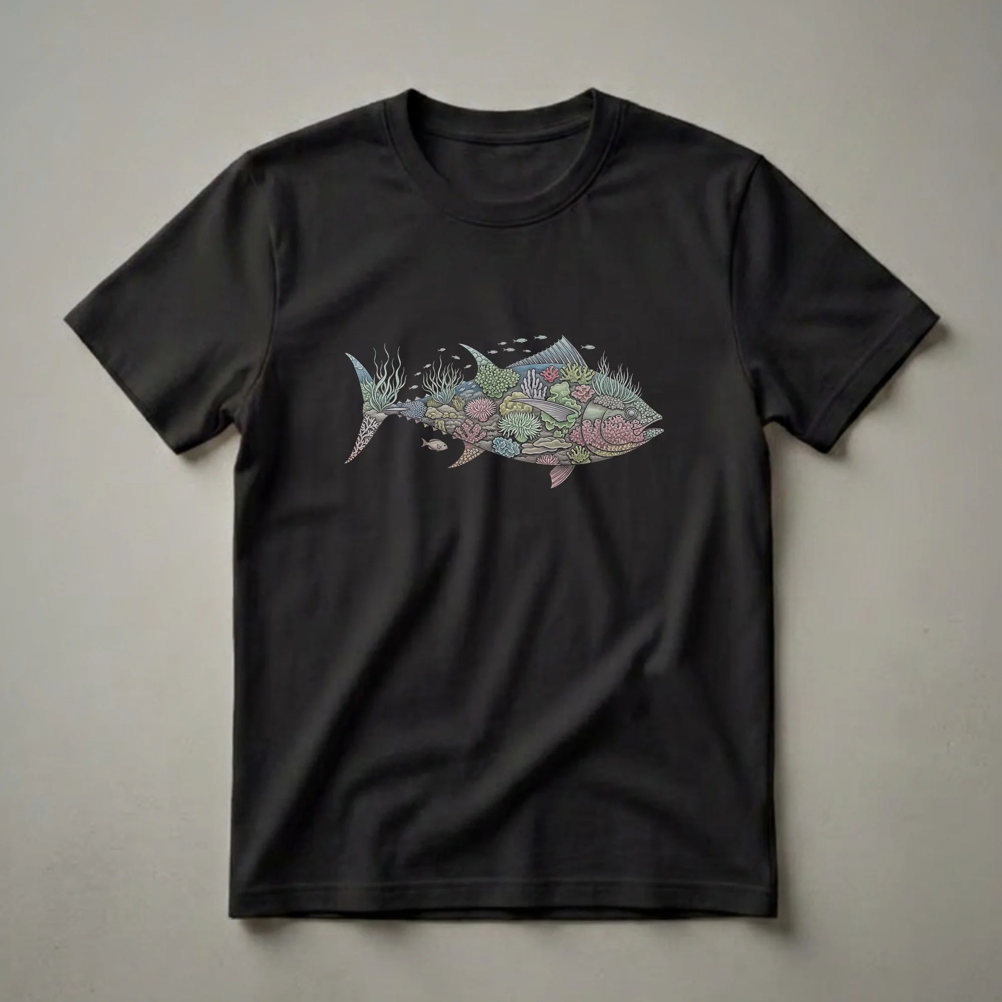 Ocean lovers and fishermen will appreciate the intricate detail of this unique tuna t-shirt. The artwork depicts a powerful tuna, its body transformed into a vibrant coral reef ecosystem. Schools of small fish swim around the larger fish, while various corals and sea anemones form its scales and fins. This artistic representation highlights the interconnectedness of marine life and the beauty of underwater worlds. Tuna, known for their speed and migratory patterns, are apex predators in the ocean, playing a crucial role in maintaining the health of marine environments. This tee serves as a wearable piece of art, celebrating the majesty of these fish and the delicate balance of their habitat. It's a thoughtful gift for anyone who cherishes the sea, enjoys fishing, or admires detailed nature illustrations. Wear this shirt to your next fishing trip, a day at the aquarium, or simply as a conversation starter about marine conservation.