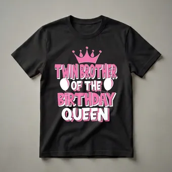 - Features bold pink lettering and a regal crown, proudly proclaiming 'Twin Brother of the Birthday Queen'.