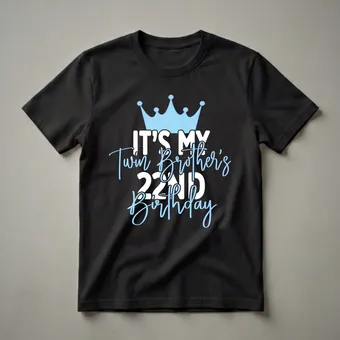Siblings who share a special bond will appreciate this graphic tee celebrating a twin brother's 22nd birthday. The design features a prominent light blue crown, symbolizing royalty and celebration, positioned above bold white text that declares 'IT'S MY Twin Brother's'. Below this, the words '22ND Birthday' are rendered in a flowing, light blue script, adding a touch of personal flair. Turning 22 marks a significant milestone, moving further into young adulthood and often a time of personal growth and new experiences. This shirt is a thoughtful gift for any sister or brother looking to acknowledge their twin's special day. It's a fantastic way to make the birthday person feel celebrated and to showcase the unique connection between twins. Wear this t-shirt to the birthday party, a family gathering, or any event where you want to highlight the twin brother's big 2-2. It's a fun and festive way for a sibling to join in the birthday cheer and make the celebration memorable.
