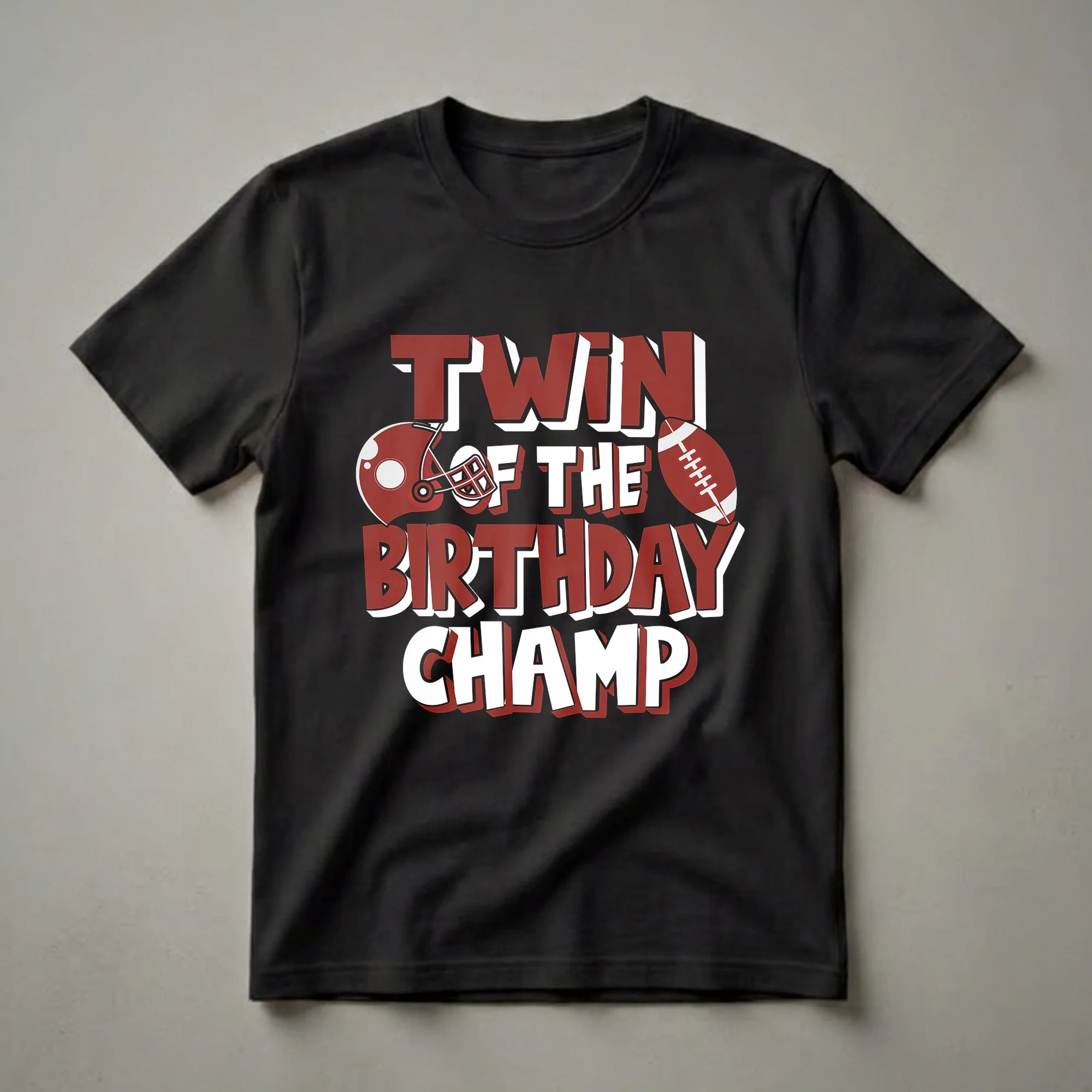 - Features bold, 3D-style lettering declaring 'Twin of the Birthday Champ' in American football style.
