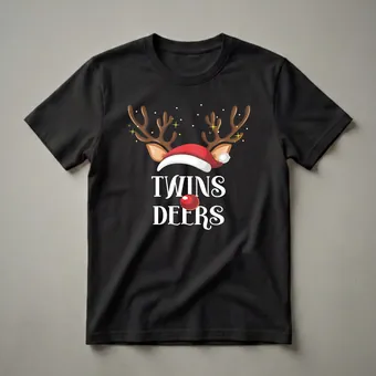 Families looking for coordinated holiday apparel will love this festive 'Twins Deers' t-shirt. The design features a playful combination of reindeer antlers, a classic red Santa hat with a white pom-pom, and the bold white text 'TWINS DEERS'. A bright red Rudolph-like nose sits between the words, adding a touch of whimsy. This graphic tee is a fun way for twins or any pair of siblings to show their holiday spirit. Reindeer are iconic symbols of the Christmas season, often associated with Santa's sleigh and the magic of winter. This shirt is a thoughtful gift for parents seeking matching outfits for their children for holiday photos, Christmas morning, or festive parties. It's a comfortable and eye-catching piece of apparel that brings a smile to everyone's face during the most wonderful time of the year. Wear this shirt to your next holiday gathering or Christmas celebration to spread cheer and festive vibes.