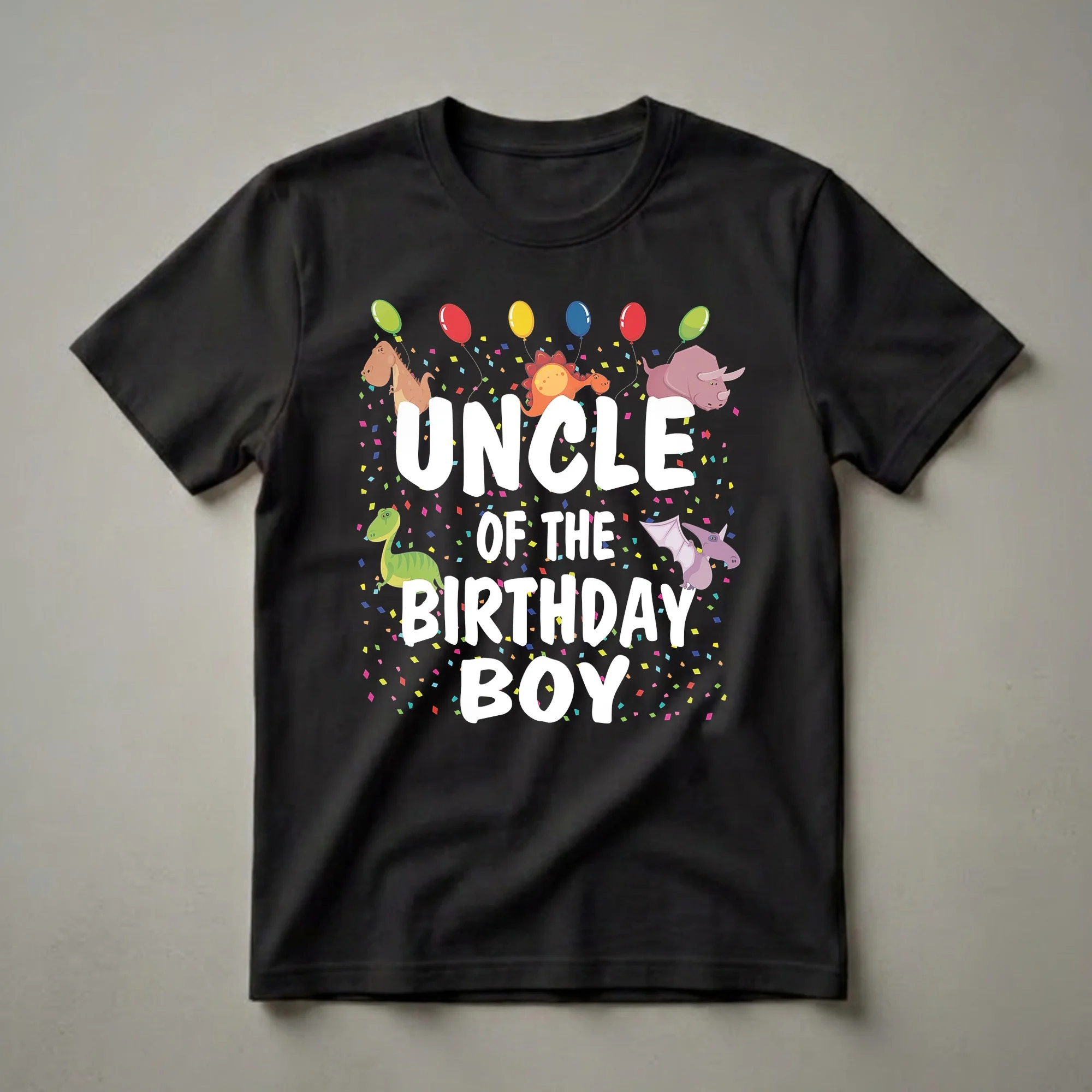 - Uncle of the Birthday Boy graphic tee with a fun dinosaur theme.