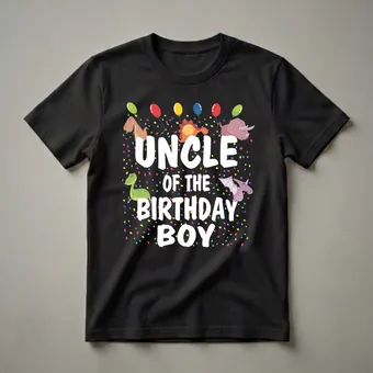 The uncle of the birthday boy can show off his special role with this fun dinosaur-themed t-shirt. The design features bold white lettering that reads "UNCLE OF THE BIRTHDAY BOY," set against a black background filled with colorful confetti. Scattered around the text are playful cartoon dinosaurs, including a Tyrannosaurus Rex, a Stegosaurus, a Triceratops, a Brontosaurus, and a Pterodactyl, along with festive balloons in red, yellow, blue, and green. This graphic tee is a fantastic way for an uncle to join in the birthday festivities, especially if the guest of honor has a fascination with prehistoric creatures. Dinosaurs, which roamed the Earth during the Mesozoic Era, continue to capture the imagination of children and adults alike. This shirt makes a thoughtful gift for any uncle who wants to stand out at a dinosaur-themed birthday party or simply wants to express his connection to the birthday boy. It's a comfortable and eye-catching piece of apparel that’s well suited for celebrating a special day and creating lasting memories. Wear this shirt to the birthday party, family gathering, or any casual event where you want to showcase your uncle pride.