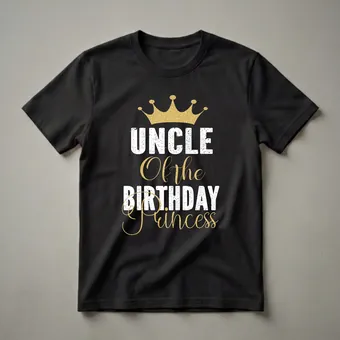 Proud uncles can now officially claim their title with this eye-catching "Uncle Of The Birthday Princess" graphic tee. The design features a regal gold crown with a textured, shimmering effect, positioned above bold, distressed white lettering that spells out the declaration. Below, the words "Birthday Princess" are rendered in an elegant, flowing gold script, adding a touch of sparkle and celebration. This shirt is a fantastic way for any uncle to show his pride and support for the special girl in his life, especially on her big day. It’s a staple piece for any family birthday gathering, whether it’s a casual backyard party or a more formal celebration. This t-shirt makes a thoughtful gift for uncles who love to spoil their nieces and want to wear their special role with pride. Imagine the smiles when he unwraps this at a birthday brunch or family get-together. It’s a fun way to commemorate a milestone birthday and highlight the unique bond between an uncle and his niece, the birthday princess.