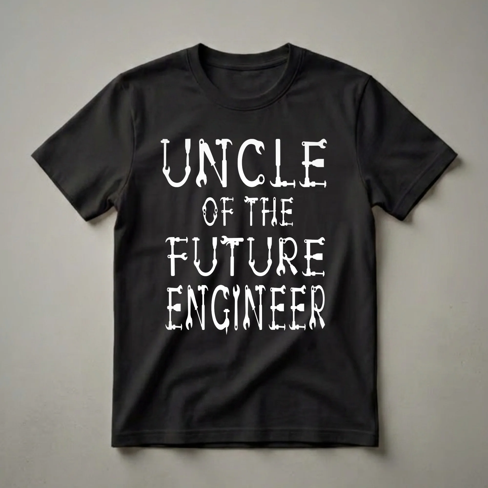Future engineers and aspiring mechanics will appreciate this eye-catching graphic tee. The bold white text, spelling out "UNCLE OF THE FUTURE ENGINEER," is creatively constructed entirely from various tools. Hammers form the 'U' and 'E' in 'FUTURE,' while wrenches and screwdrivers shape the letters of 'UNCLE' and 'ENGINEER.' This shirt is a fantastic way for an uncle to show pride in his niece or nephew's budding interest in engineering or mechanics. It's a thoughtful gift for uncles who support their young family members' dreams of building and creating. This t-shirt works well for casual wear, family gatherings, or birthday parties celebrating the young innovator. The design itself speaks to the hands-on nature of engineering, where tools are essential for bringing ideas to life. Give this unique shirt to the uncle who is always ready to help with projects or share his knowledge of how things work. It’s a staple in the collection for any proud uncle.