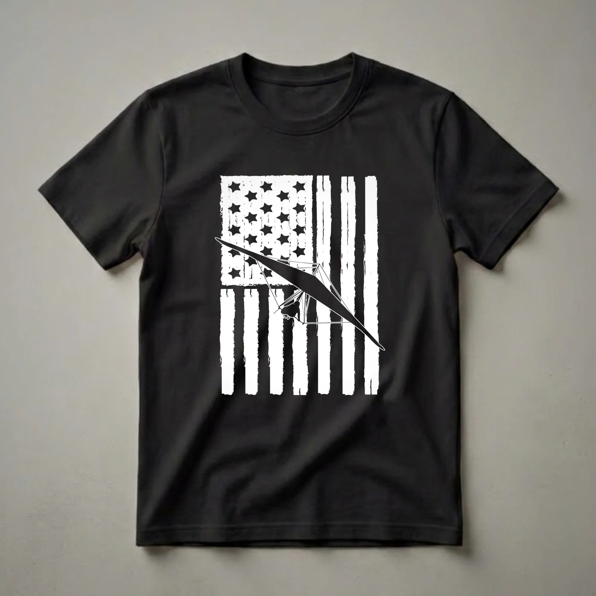 - Features a distressed American flag design with a hang glider silhouette.