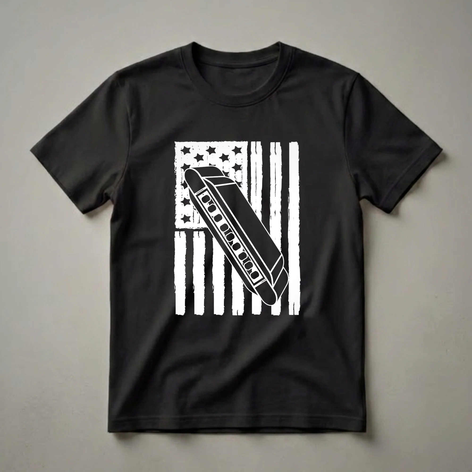 American music lovers who appreciate the soulful sound of the harmonica will reach for this striking graphic tee. The design features a stylized, distressed American flag with a prominent harmonica graphic placed diagonally across the stars and stripes. This eye-catching t-shirt celebrates both patriotism and a passion for blues, folk, and country music, genres where the harmonica often shines. The harmonica, also known as a mouth organ or blues harp, is a portable free-reed wind instrument played by blowing and drawing air through holes. Its distinctive sound has been a staple in American music for centuries, from early blues pioneers to modern folk artists. This shirt is a thoughtful gift for the harmonica player in your life, or for anyone who enjoys the rich heritage of American music. It's a go-to tee for casual outings, music festivals, or simply relaxing at home while listening to your favorite tunes. Wear this tee to express your dual love for the USA and the melodies of the harmonica.