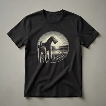 Airedale Terrier owners who appreciate classic art will reach for this unique graphic tee. The design features a striking Airedale Terrier standing in tall, textured grass, gazing out at a serene body of water. Behind the dog, a large, textured circle suggests a setting sun or moon, casting a warm glow over the scene. The entire image is framed within a circular border, reminiscent of vintage etchings or woodcuts, giving it a timeless, retro feel. Airedales, known as the 'King of Terriers,' are a robust breed originating from Yorkshire, England, originally bred for hunting and later for police and military work. This shirt captures the dignified and adventurous spirit of the breed. It makes a thoughtful gift for any Airedale enthusiast, whether they are celebrating a birthday or simply want to showcase their canine companion. Wear this comfortable tee to your next dog park visit or casual outing, and let your Airedale pride shine.