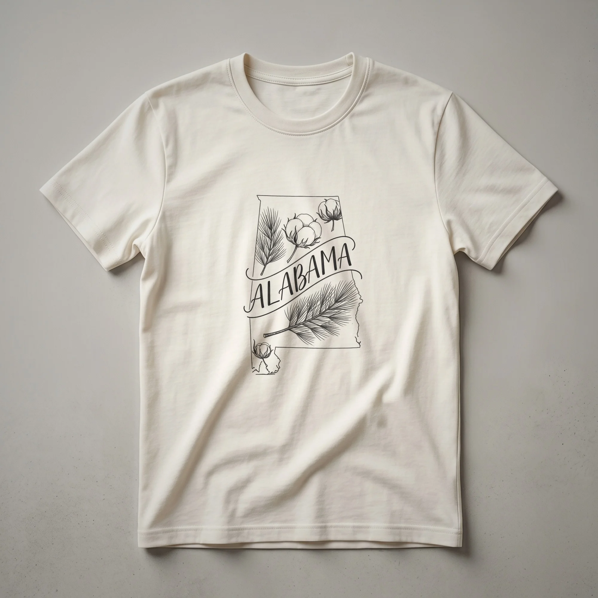 Alabama residents and fans of the Heart of Dixie will appreciate this unique graphic tee. The design features a detailed line drawing of the state's outline, intricately filled with elements that represent its natural beauty and heritage. Pine branches, symbolizing the state's abundant forests, are artfully intertwined with fluffy cotton bolls, a nod to Alabama's historical significance in cotton production. The word "ALABAMA" is elegantly scripted across a banner within the map, adding a vintage touch. This shirt is more than just apparel; it's a wearable piece of art that celebrates the state's identity. It's a thoughtful gift for anyone who calls Alabama home, whether they're a lifelong resident or have fond memories of the state. This tee works well for casual outings, family gatherings, or simply showing off your state pride. Wear it to a local festival or a weekend brunch to spark conversations about your love for Alabama. The design's classic aesthetic makes it a staple in any wardrobe, a thoughtful choice for those who cherish their Southern roots.