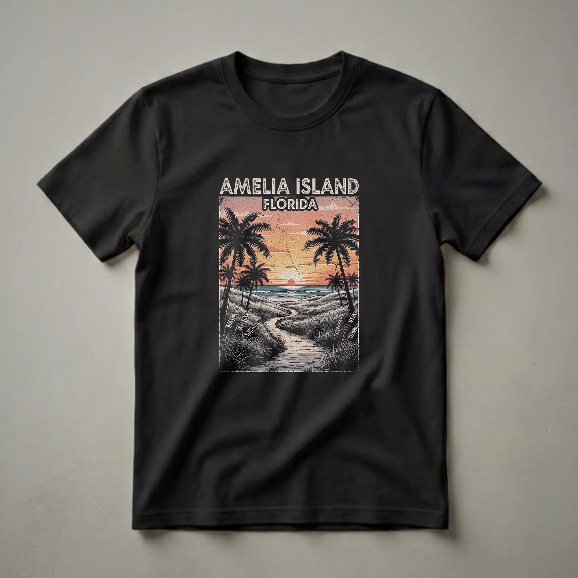 - Amelia Island Florida tee for travelers who love coastal sunsets and palm trees.