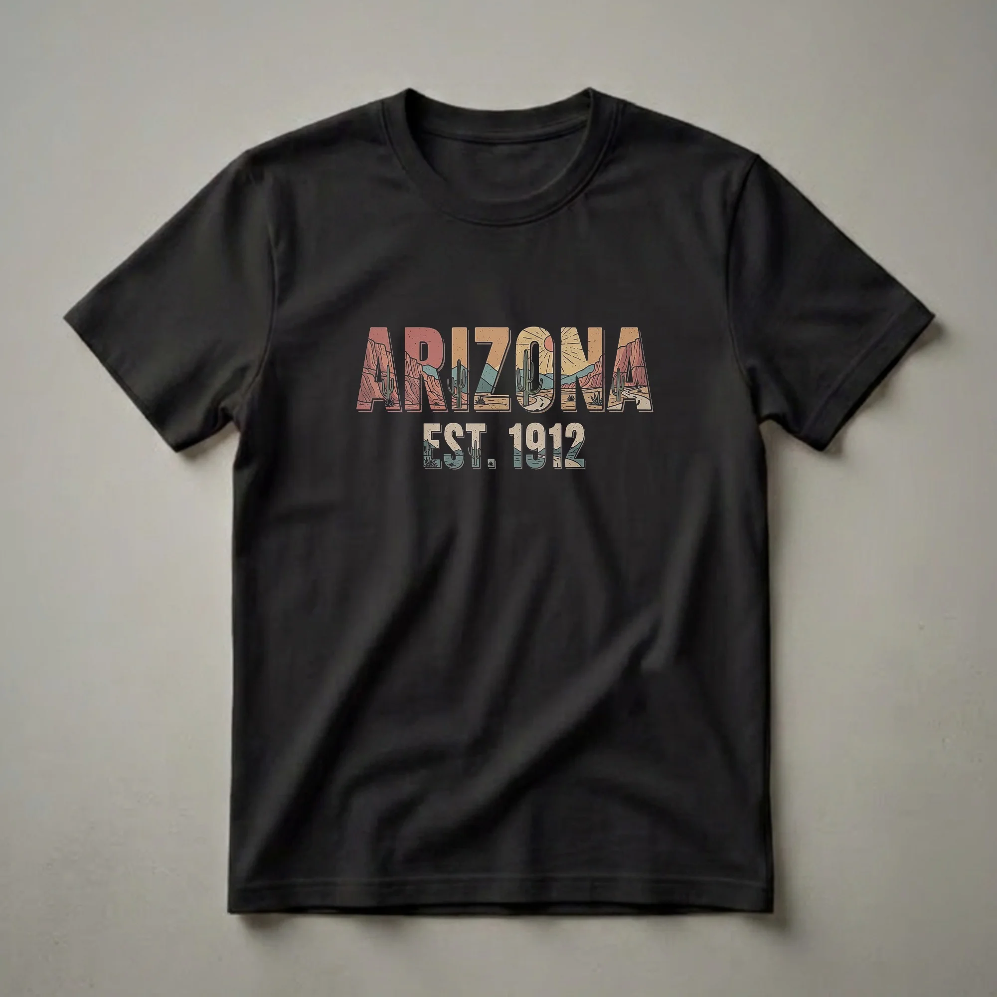 Arizona natives and those who love the Grand Canyon State will reach for this unique graphic tee. The design showcases the word ARIZONA filled with a vibrant desert scene, complete with iconic saguaro cacti, red rock formations, and a radiant sun. Below, "EST. 1912" marks the year Arizona officially became a state, adding a touch of historical pride. This shirt is a thoughtful gift for anyone with a connection to Arizona, whether they're a lifelong resident, a recent transplant, or a frequent visitor. Imagine wearing this eye-catching apparel on a road trip through the Sonoran Desert or while exploring Sedona's red rocks. It’s a comfortable and stylish way to express your appreciation for the unique beauty and heritage of Arizona. This t-shirt serves as a wearable reminder of the state's rugged landscapes and enduring spirit, making it a staple for any Southwest enthusiast's wardrobe. Arizona, admitted to the Union on February 14, 1912, is known for its diverse geography, from deserts to pine forests, and its rich Native American history.