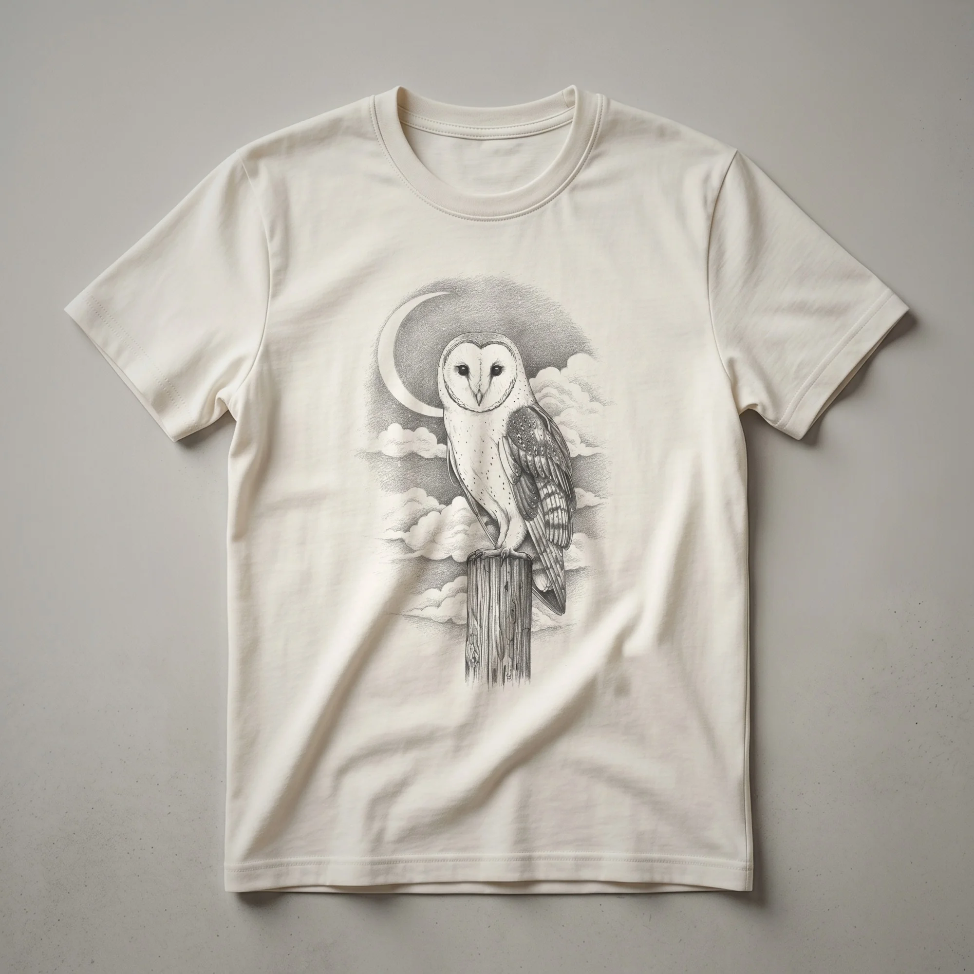 - A unique hand-drawn barn owl and moon graphic tee for bird lovers.