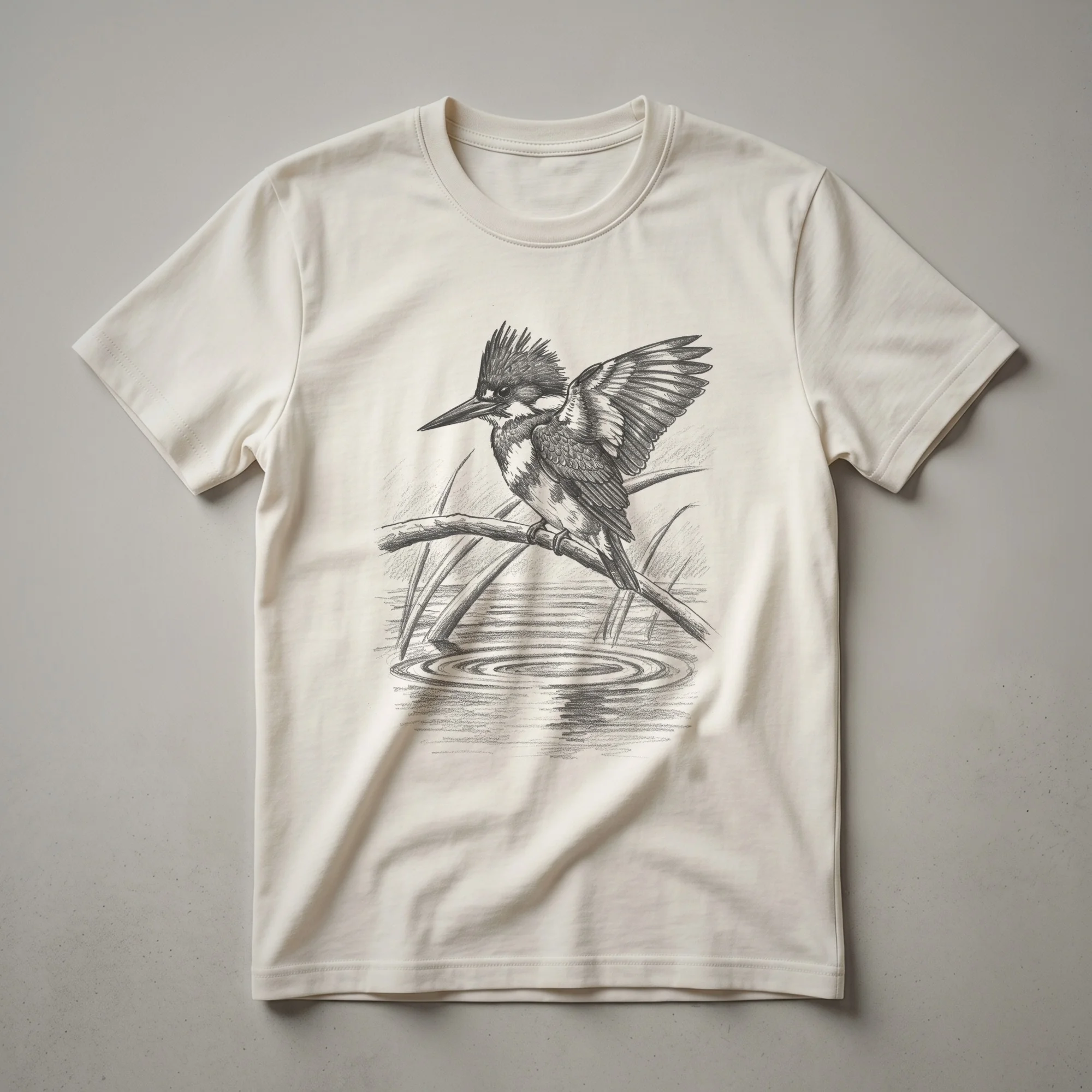- Features a detailed vintage hand-drawn art design of a belted kingfisher.