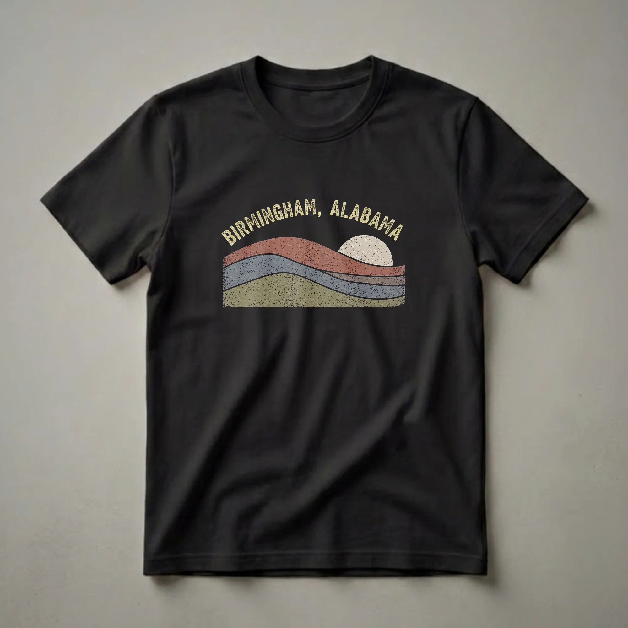 Birmingham, Alabama residents and visitors can now showcase their pride with this retro-inspired graphic tee. The design features a stylized sunset over rolling hills, rendered in a vintage color palette of muted reds, blues, and greens, all with a distressed texture for an authentic retro feel. The words "BIRMINGHAM, ALABAMA" are arched across the top in a distressed, golden-yellow font. Birmingham, known as the "Magic City," is a significant industrial and cultural hub in Alabama, famous for its role in the Civil Rights Movement and its vibrant arts scene. This t-shirt works well for anyone who has a connection to Birmingham, whether they live there, grew up there, or have fond memories of visiting. It makes a thoughtful gift for friends or family members who appreciate vintage travel designs and state pride apparel. Wear this shirt to casual outings, local events, or while exploring the city's many attractions, from the Vulcan Park and Museum to the historic Civil Rights District.