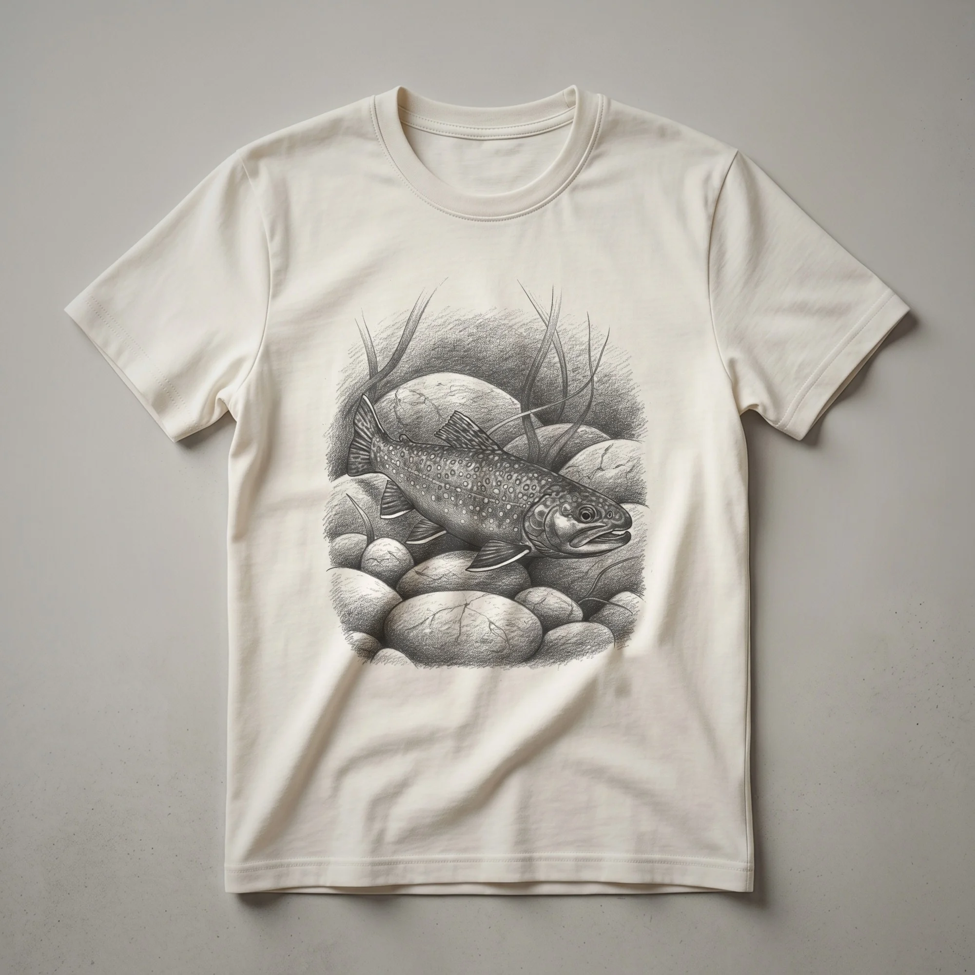 Brook trout enthusiasts will appreciate this hand-drawn graphic tee featuring a detailed illustration of the species. The artwork captures the distinctive markings and coloration of the brook trout, presented in a classic, vintage style that evokes a sense of nostalgia for the outdoors. Brook trout, scientifically known as Salvelinus fontinalis, are native to eastern North America and are prized by anglers for their challenging fight and beautiful appearance. They typically inhabit clear, cold, and well-oxygenated streams and rivers, often found in shaded areas with abundant aquatic insect life. This shirt is a staple for any fisherman or woman who enjoys spending time by the water, whether fly fishing in a mountain stream or casting a line in a serene lake. It makes a thoughtful gift for the angler in your life who cherishes the tranquility and excitement of the sport. Wear this comfortable tee on your next fishing trip or casual outing to display your passion for these magnificent fish and the natural environments they inhabit.